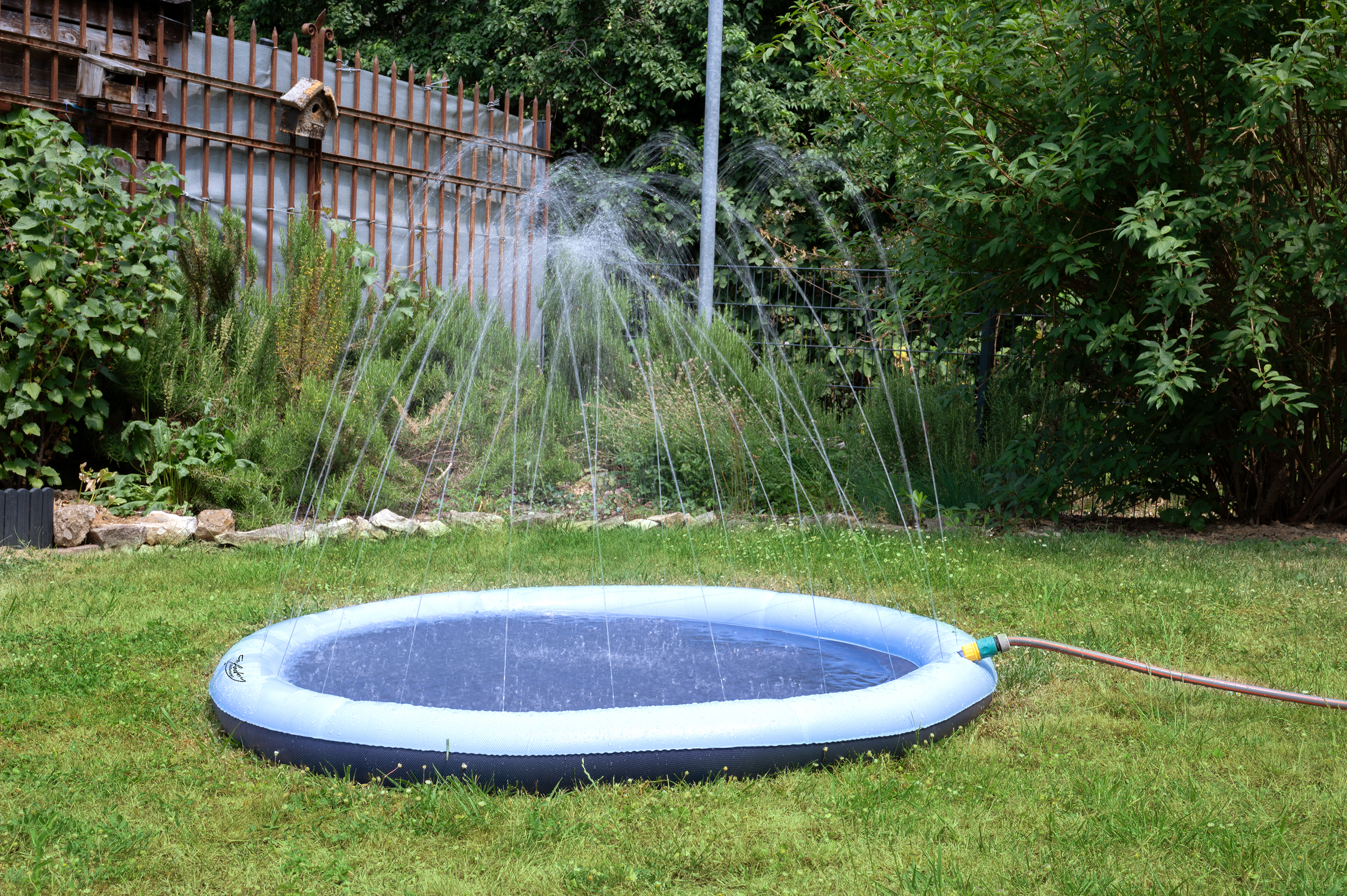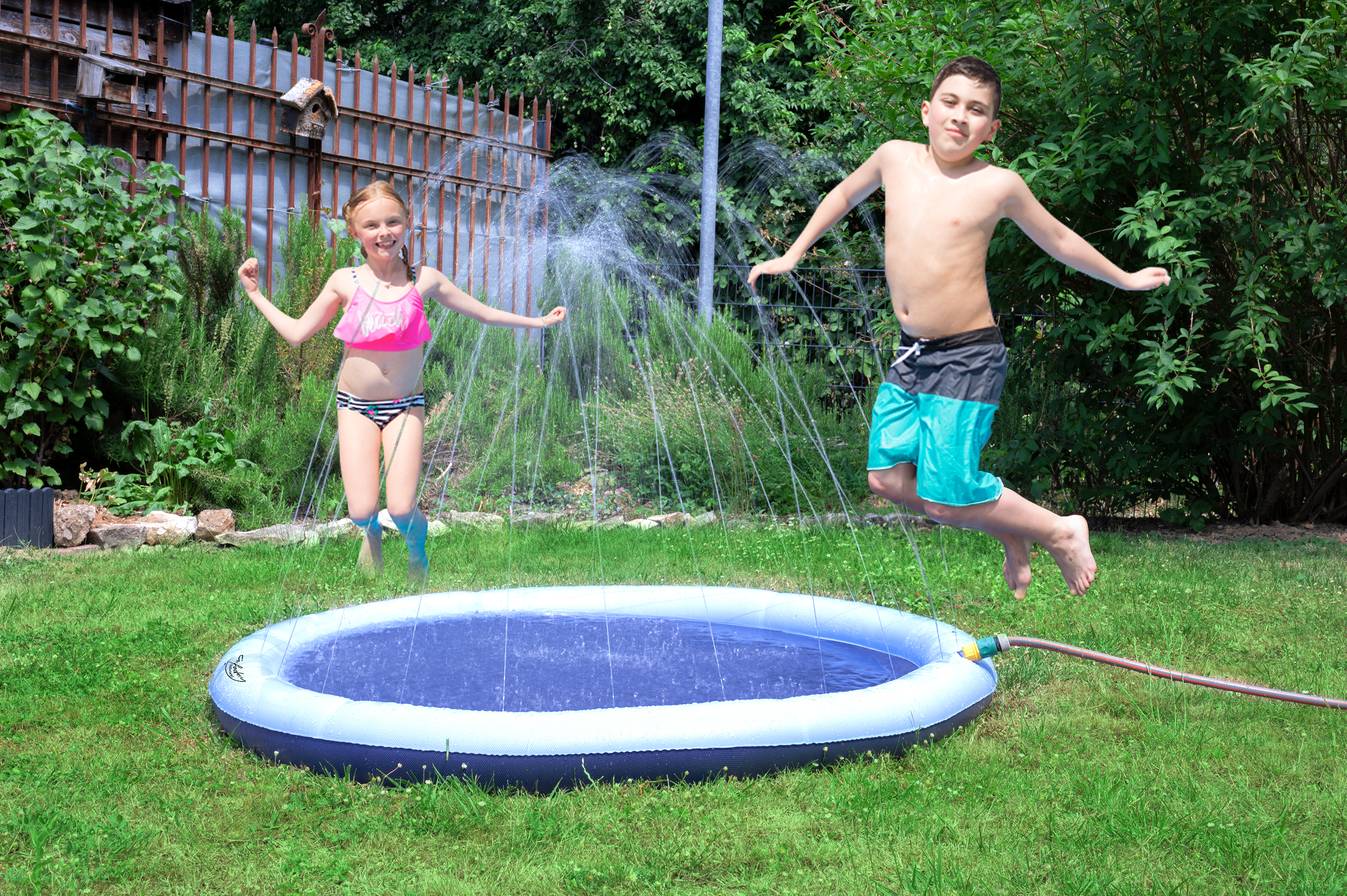 Im Handumdrehen aufgebaut: Einfach Wasser-Spielmatte entfalten, den handelsüblichen Gartenschlauch anschließen und Wasserhahn aufdrehen - schon kann der Spaß beginnen!