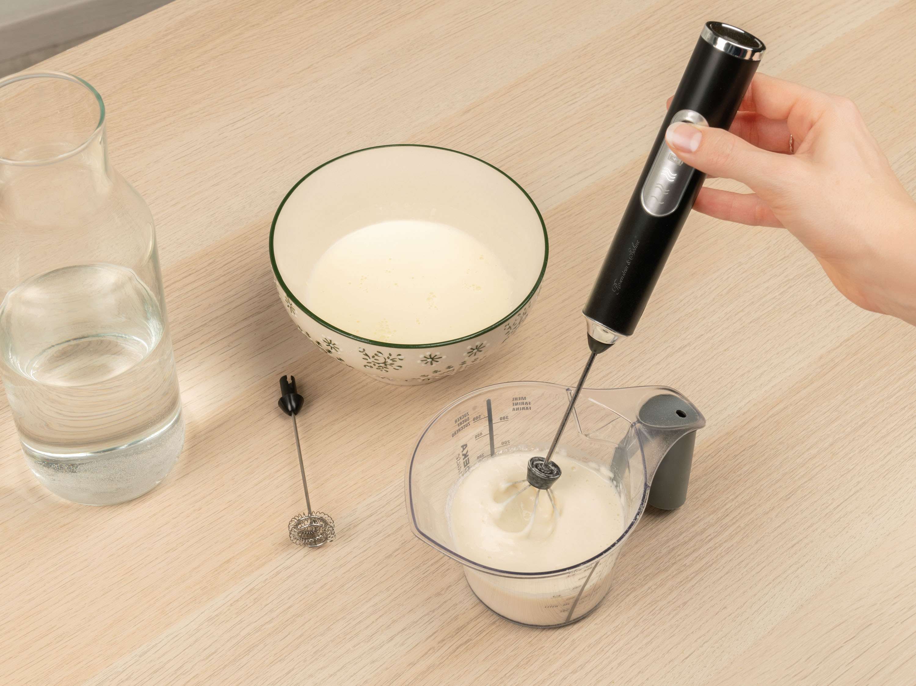 (lifepr) (Buggingen, 02.08.2023) Mit dem 2in1-Akku-Milchaufschäumer & Quirl von Rosenstein & Söhne lässt sich Milchschaum wie vom Barista herstellen. Auch Eiweiß-Shakes sowie Babybreis, Eier und Sahne sind schnell verquirlt.