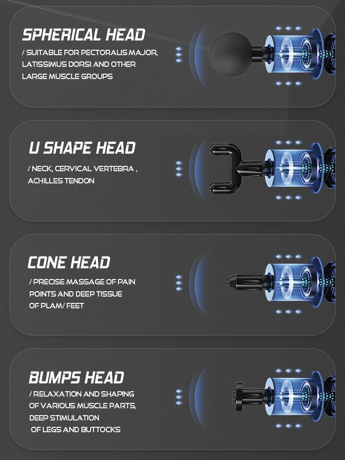 Beste Massage für jeden Muskel: Mit dem Kugelaufsatz massiert man großflächig zum Beispiel an Beinen, Rücken und Gesäß. Oder mit dem pilzförmigen Aufsatz die inneren und äußeren Muskeln an Bauch, Brust und Armen. Der konische Aufsatz ist ideal zur punktuellen Massage an Fußsohlen und Handflächen geeignet. Und mit dem U-förmigen Aufsatz stimuliert man ganz einfach die Akupunkturpunkte am Körper!