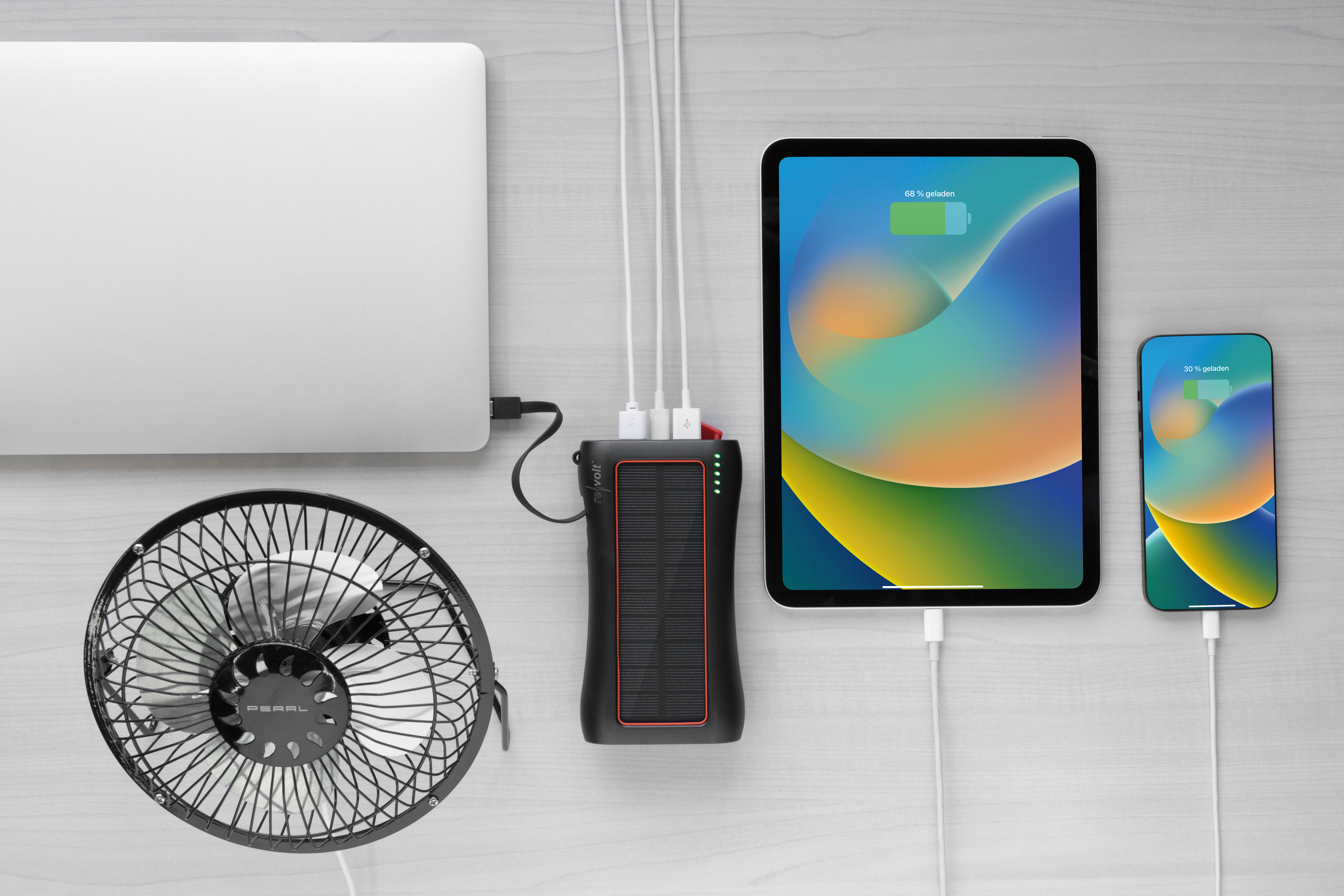 Bis zu 4 Mobilgeräte gleichzeitig laden: Mit bis zu 15 Watt Gesamtleistung hat man mit der Kurbel-Dynamo-Powerbank von revolt eine starke Stromquelle! So lädt man z.B. den Tablet-PC und versorgt gleichzeitig einen USB-Ventilator mit Strom. Wird ein USB-C-Ladekabel benötigt, hat man seines aber vergessen? Kein Problem dank integriertem und ausziehbarem Ladekabel. Bei dieser Powerbank ist wirklich an alles gedacht!