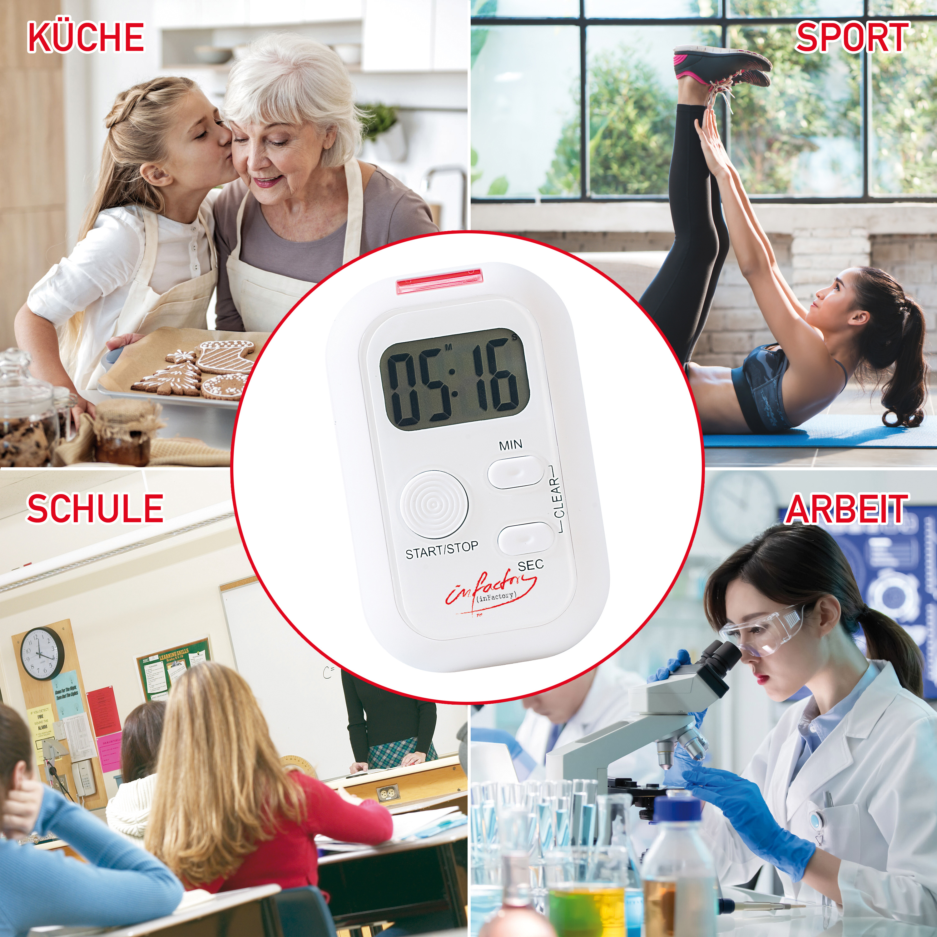 Dieser praktische Helfer ist seinen Artgenossen deutlich überlegen: Der Timer mit Licht- und Vibrationsalarm von infactory signalisiert die verstrichene Zeit nicht nur akustisch, sondern sowohl optisch per roter LED als auch durch Vibrationsalarm.