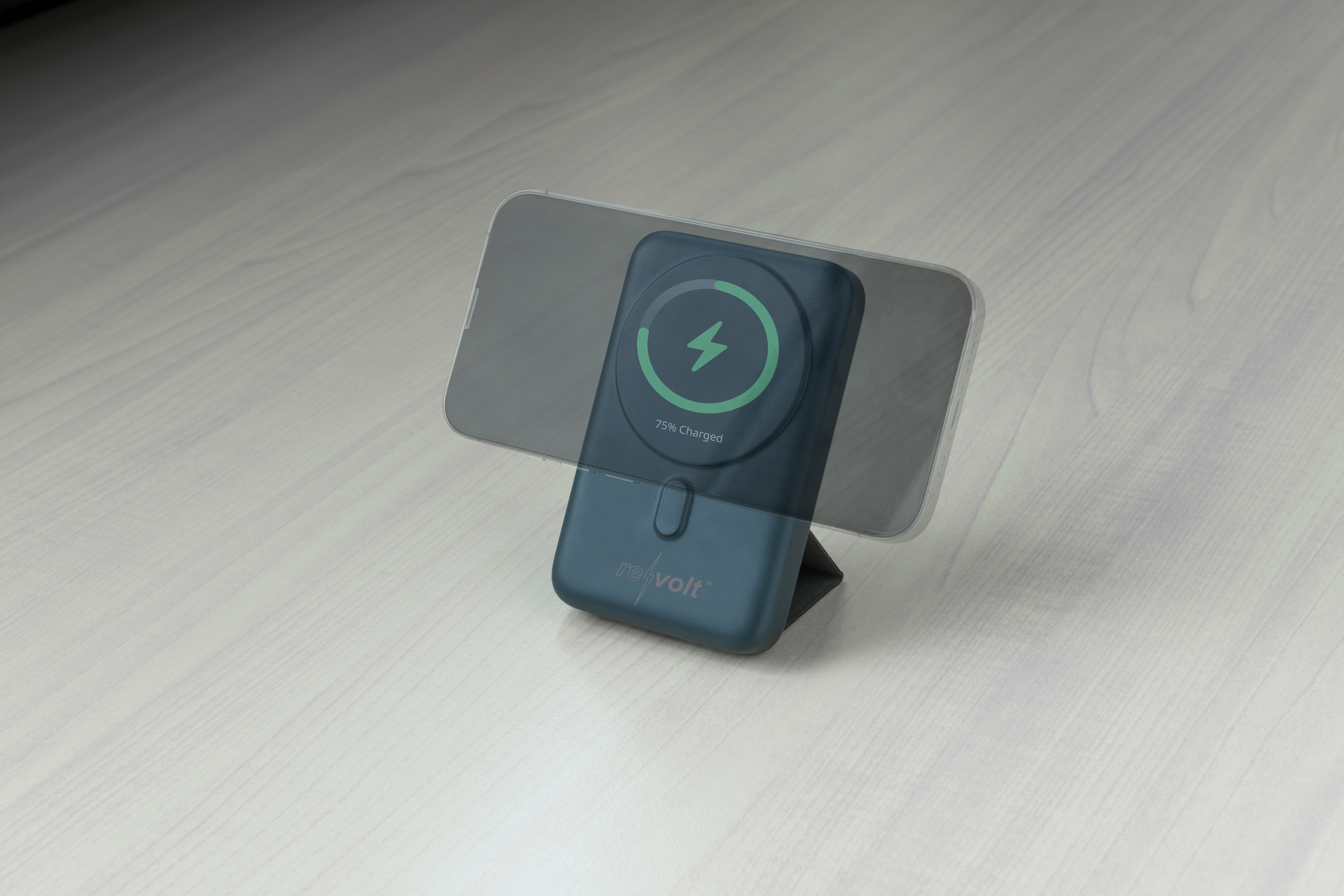 (lifepr) (Buggingen, 05.09.2023) Mit der magnetischen Powerbank 10.000 mAh PB-385 von revolt ermöglicht die kabellose Lade-Technologie überall. Dank ausklappbarem Standfuß kann man gleichzeitig laden und beispielsweise Videos schauen!