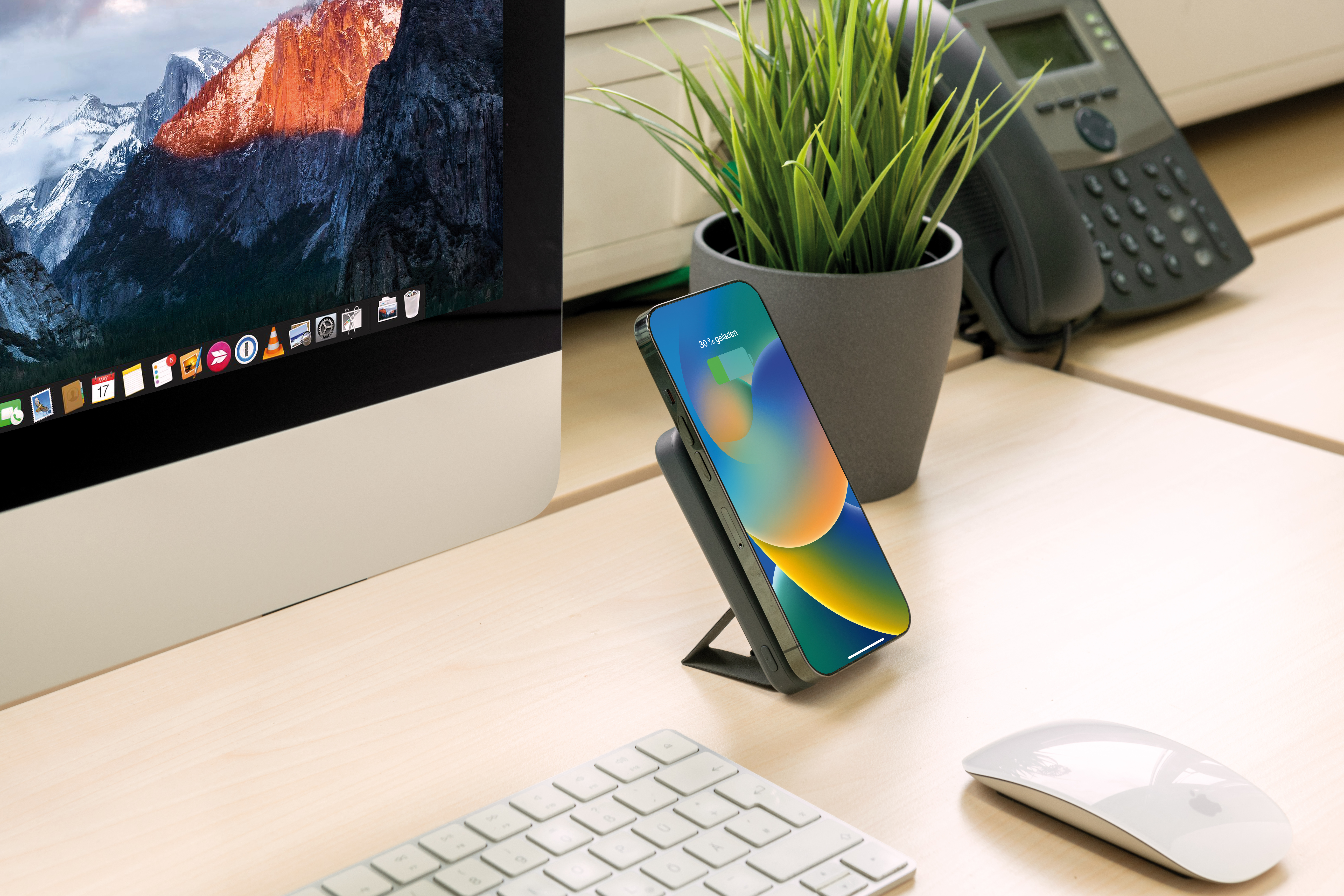 Das Smartphone beim Laden im Blick behalten: Dank dem ausklappbaren magnetischen Ständer liest man auch beim Aufladen bequem Nachrichten oder surft im Internet.