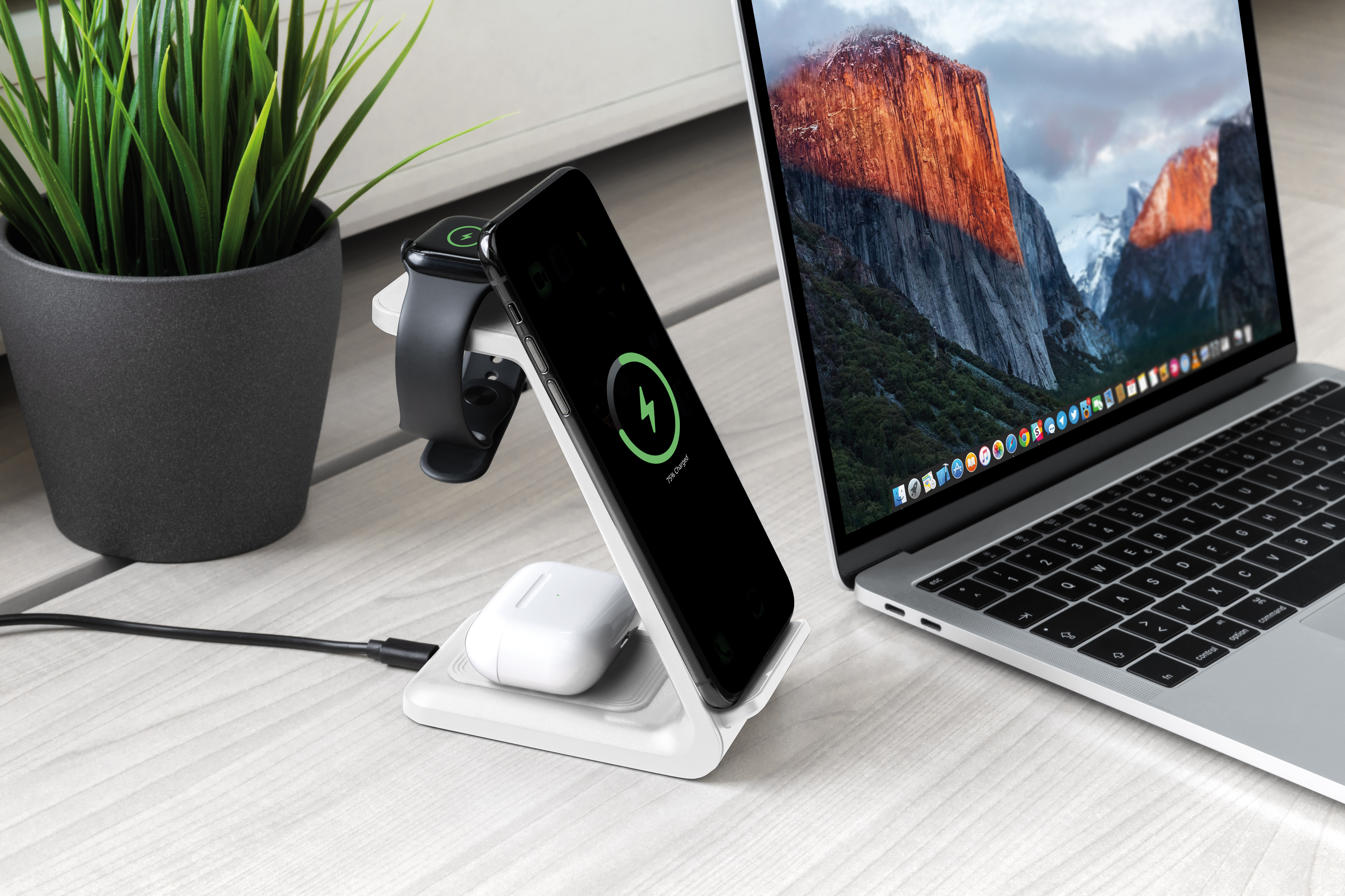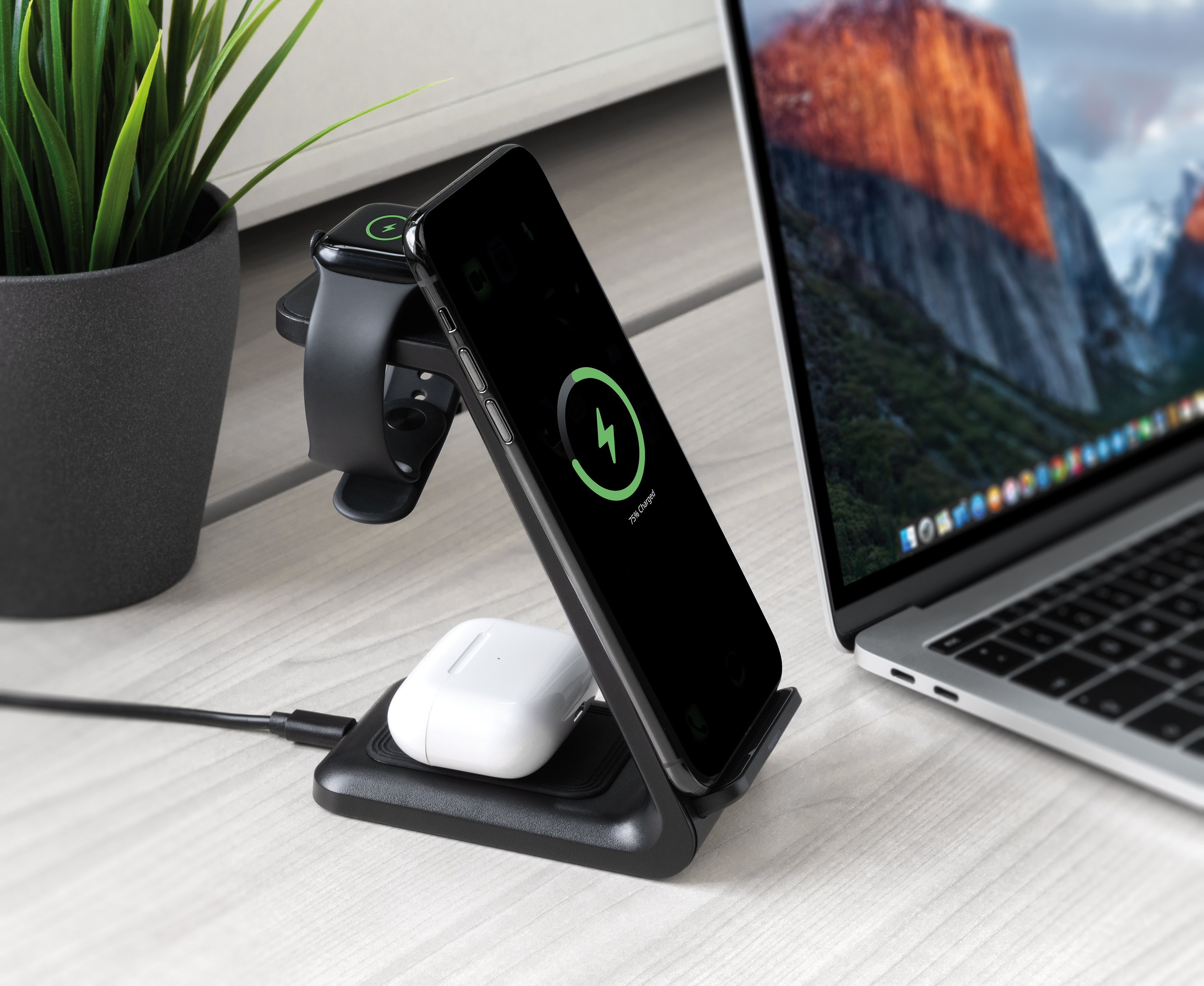 Das Qi-kompatible Smartphone oder iPhone bequem kabellos laden: Einfach das Mobiltelefon in den neuen 3in1-Ladeständer stellen. Der Ladevorgang startet automatisch - ohne dass ein Kabel eingesteckt werden muss. Anhand der Ladestatus-LED erkennt die Ladestation von Callstel immer sofort, ob der Akku vollgeladen ist. Auch Apple Watch und AirPods laden: Einfach auf der entsprechenden Ladefläche platzieren und schon tanken die Geräte kabellos und automatisch neue Energie.