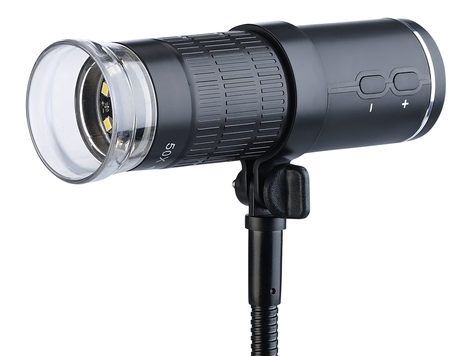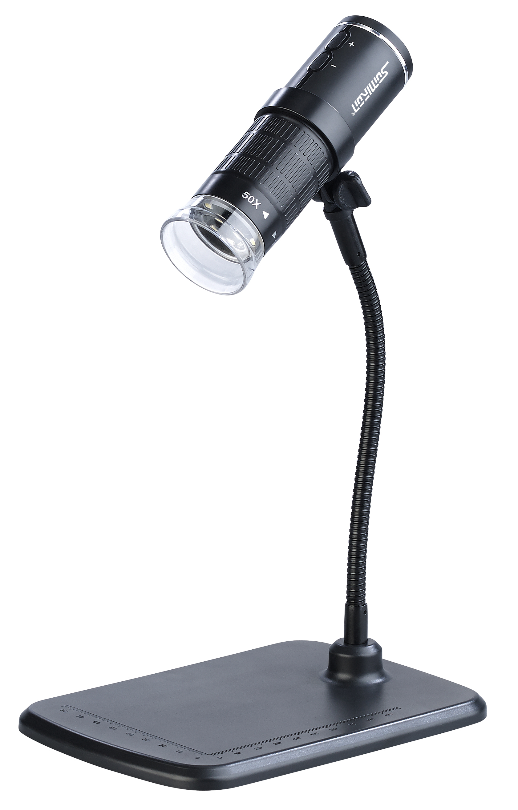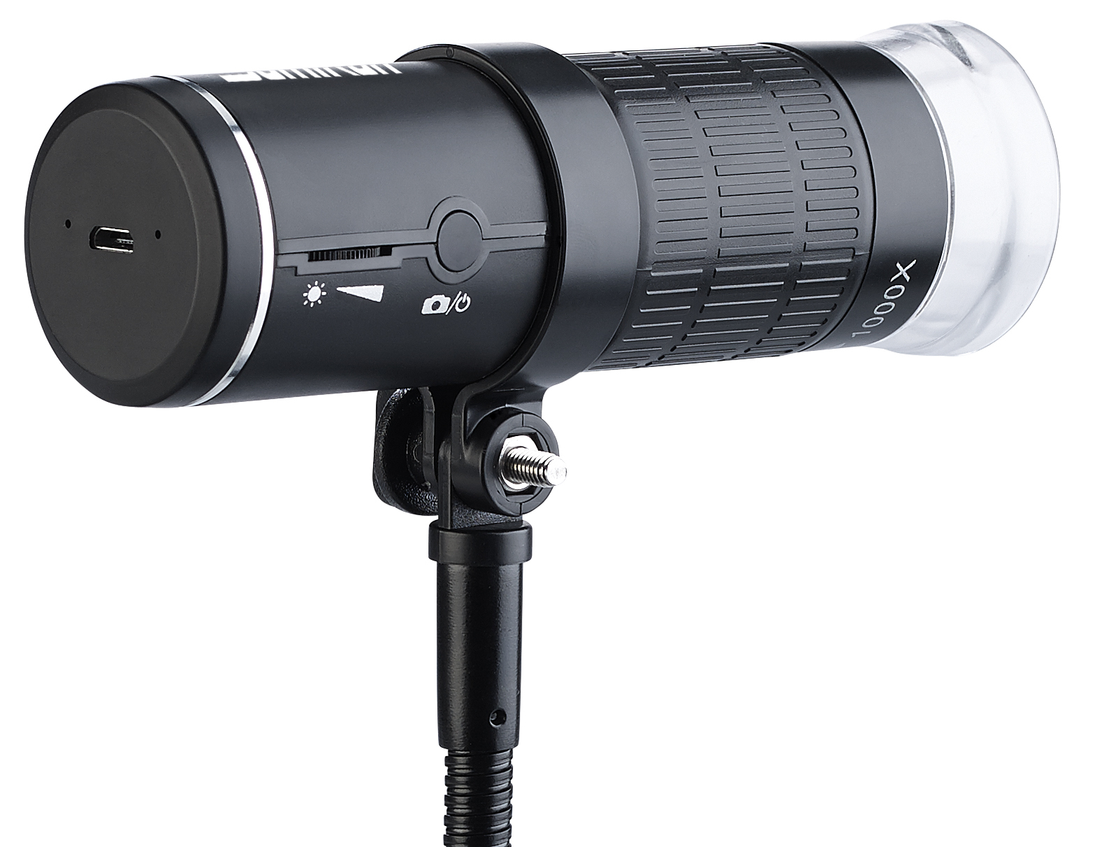 Volle Flexibilität: Das Mikroskop hält man entweder in der Hand oder befestigt es am Schwanenhals-Ständer und bringt es in jede gewünschte Position. Dank Akku-Betrieb genießt man dabei maximale Bewegungsfreiheit!