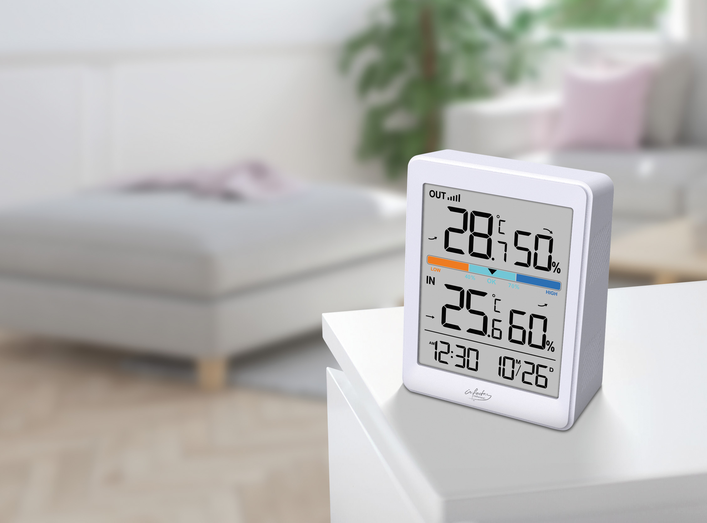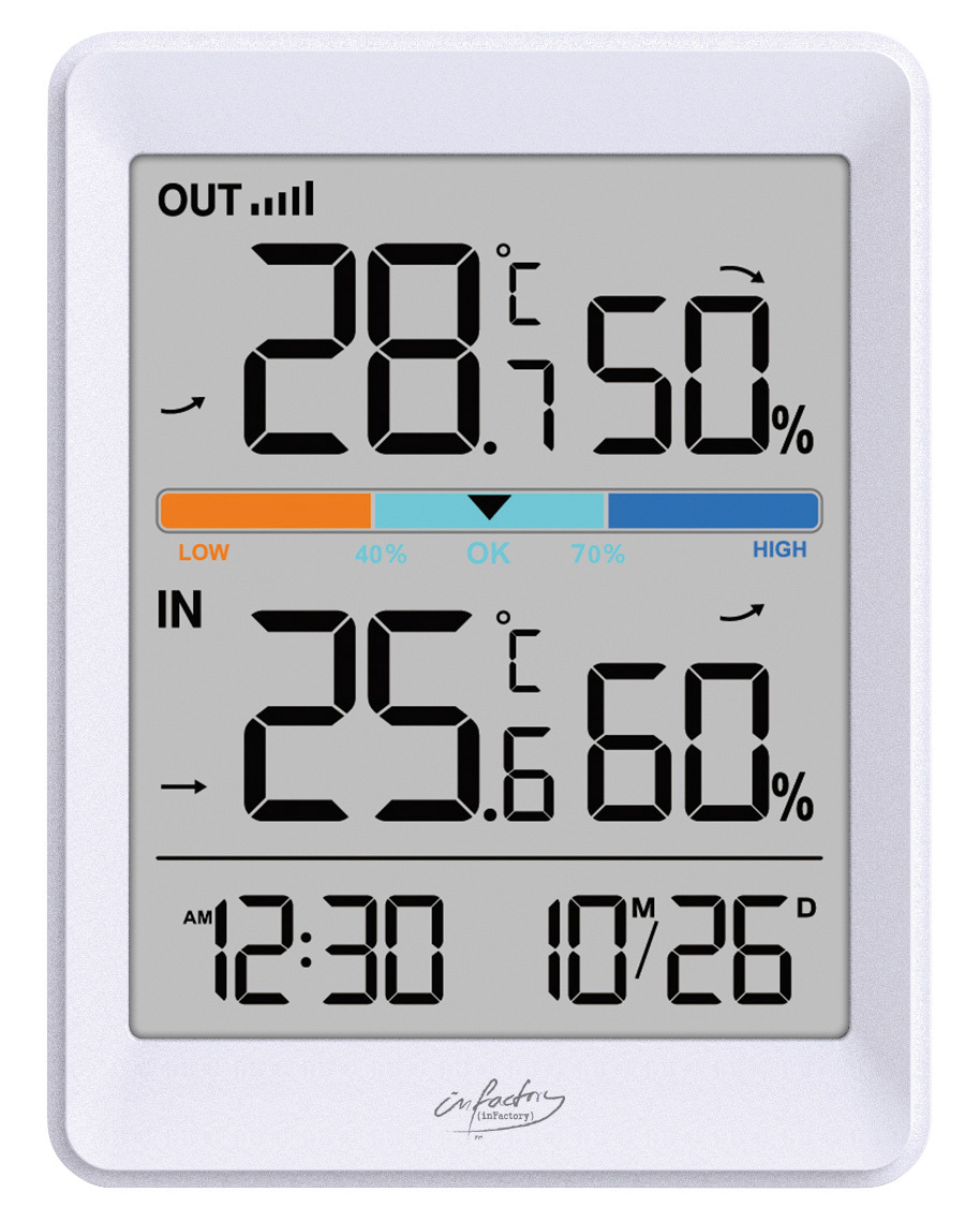 Über das Klima drinnen wie draußen informiert: Auf dem großen Display des digitalen Innen- und Außenthermometers von infactory hat man es dank gleichzeitiger Temperatur- und Luftfeuchtigkeits-Anzeige für drinnen und draußen immer im Blick. Die Komfort-Anzeige lässt einen zudem wissen, wie es um die optimale Temperatur und Luftfeuchtigkeit im Wohnraum steht!