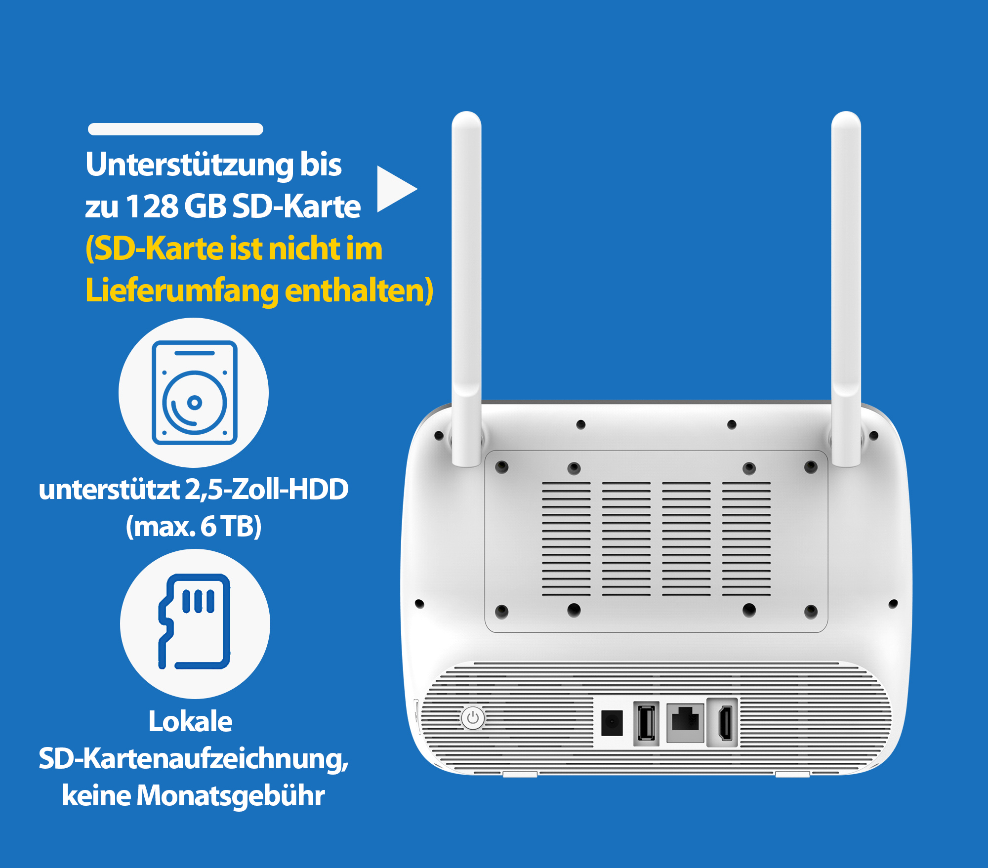 Flexible Speicher-Möglichkeiten: Der Rekorder hat Platz für eine Standard- oder SSD-Festplatte im 2,5"-Format und mit bis zu 6 TB Speicherplatz! Und hat man gerade nur eine microSD-Speicherkarte mit bis zu 128 GB zur Hand, nutzt man diese als Speicher!