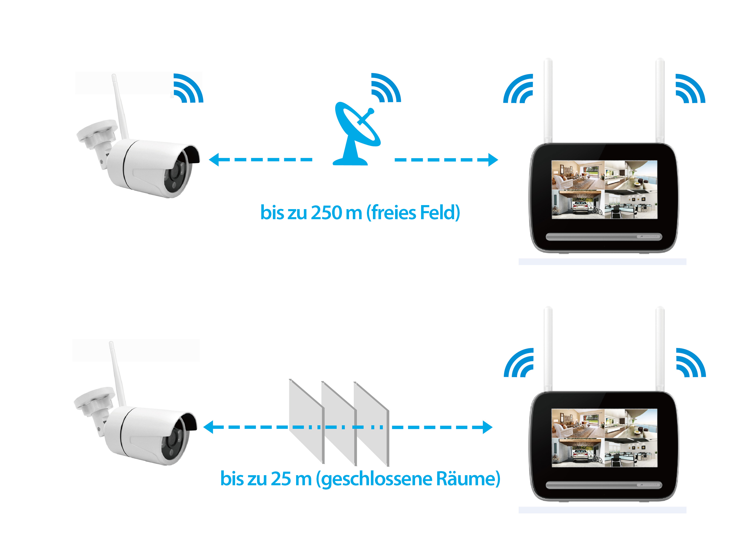 Automatische Überwachungs-Aufzeichnungen in hoher 2K-Auflösung: Bis zu 4 hochauflösende Funkkameras lassen sich mit dem Funk-Überwachungsrekorder von VisorTech verbinden. Schon startet der Überwachungsrekorder bei erkannter Bewegung automatisch die Aufnahme. Und das bei mehreren verbundenen Kameras auch von allen Kameras gleichzeitig. Und einem entgeht nichts mehr!