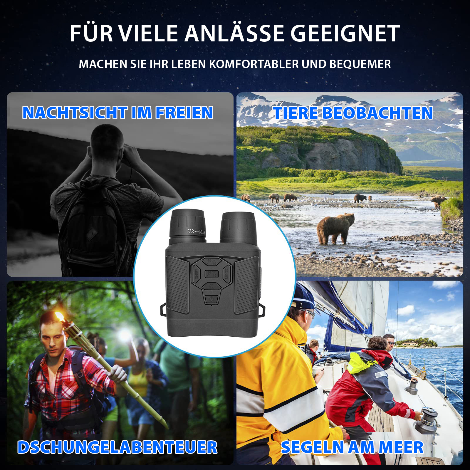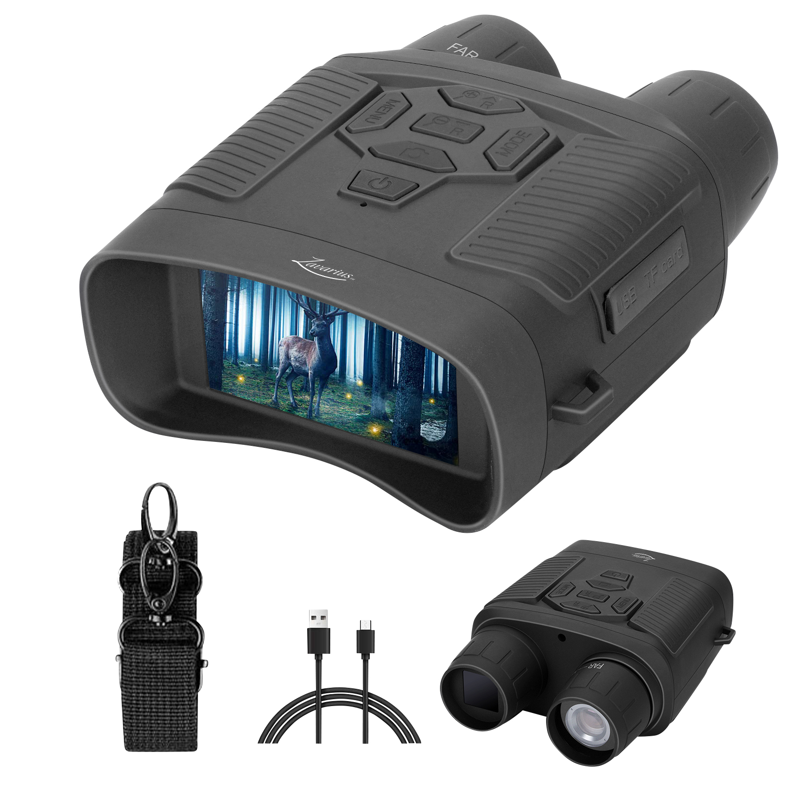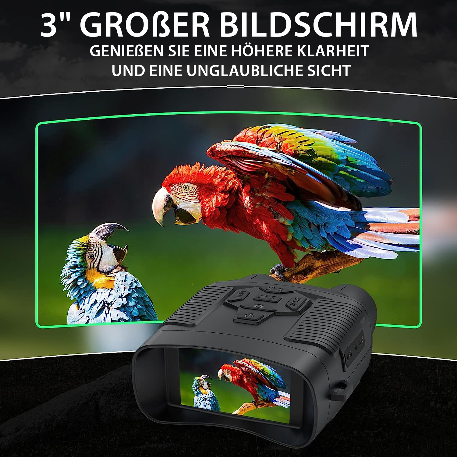 Mit dem binokularen Akku-Nachtsichtgerät DN-550 von Zavarius sieht man alles ganz genau: Auf dem großen Farbdisplay mit einstellbarer Hintergrundbeleuchtung erhält man gestochen scharfe Bilder und hat dabei immer alles im Blick.
