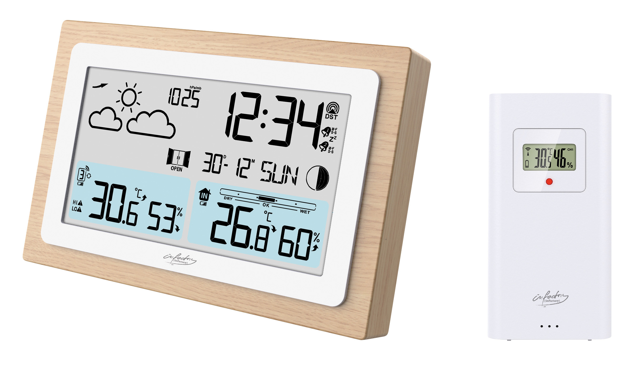 (lifepr) (Buggingen, 01.12.2023) Die Funk-Wetterstation FWS-100 im Echtholz-Rahmen von infactory vereint zeitloses Design mit moderner Technik. Der hochwertige Rahmen fügt sich elegant in jeden Raum ein und macht die Wetterstation zu einem dekorativen Element. Mit präzisen Wettervorhersagen, Uhr- und Weckerfunktion sowie einem benutzerfreundlichen Display bietet sie vielseitige Funktionen für den Alltag. Die automatische Funkzeitaktualisierung sorgt für präzise Zeitangaben, während das gut ablesbare Display alle relevanten Informationen wie Wettertrend, Mondphase und Barometer übersichtlich darstellt.