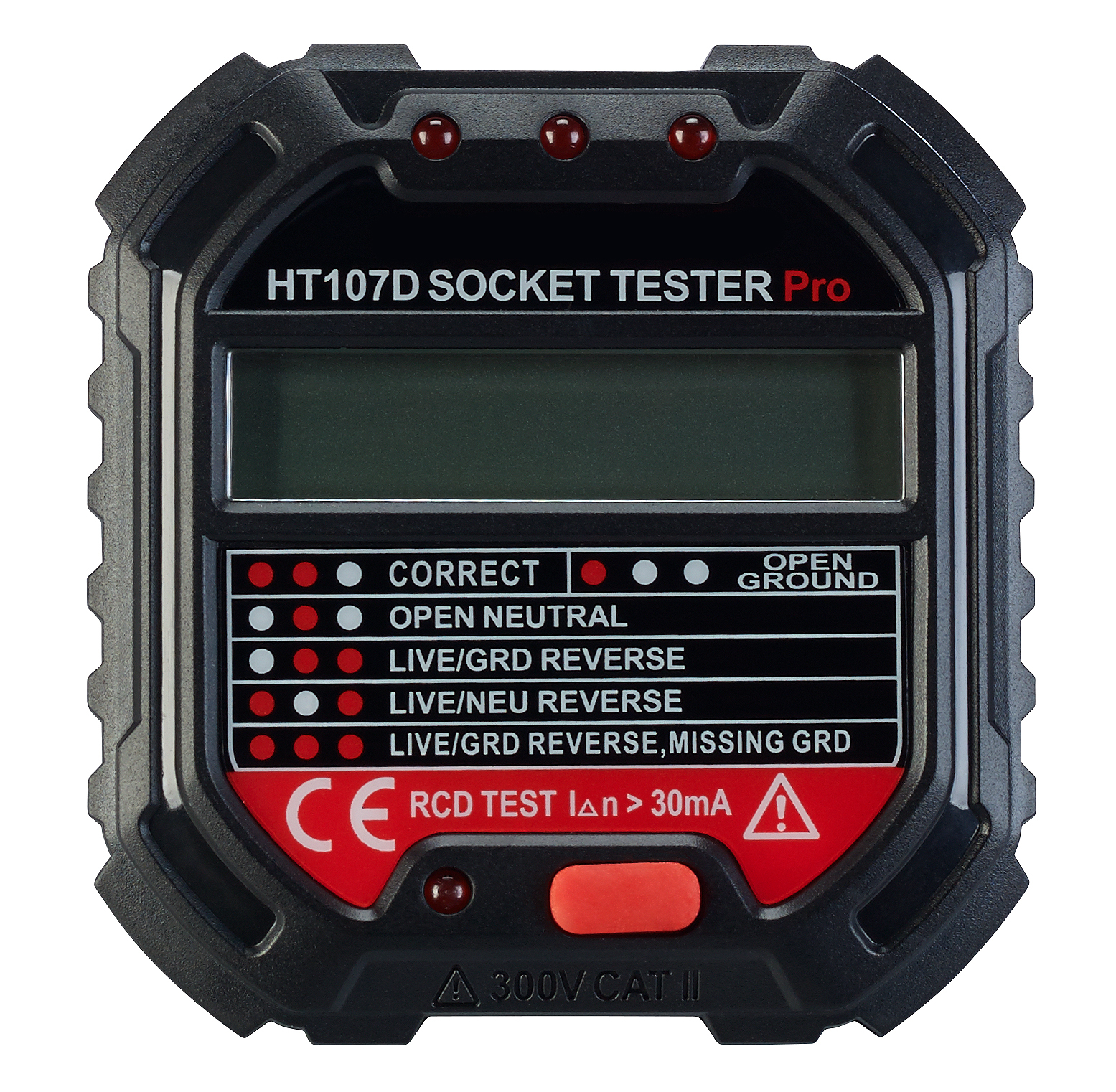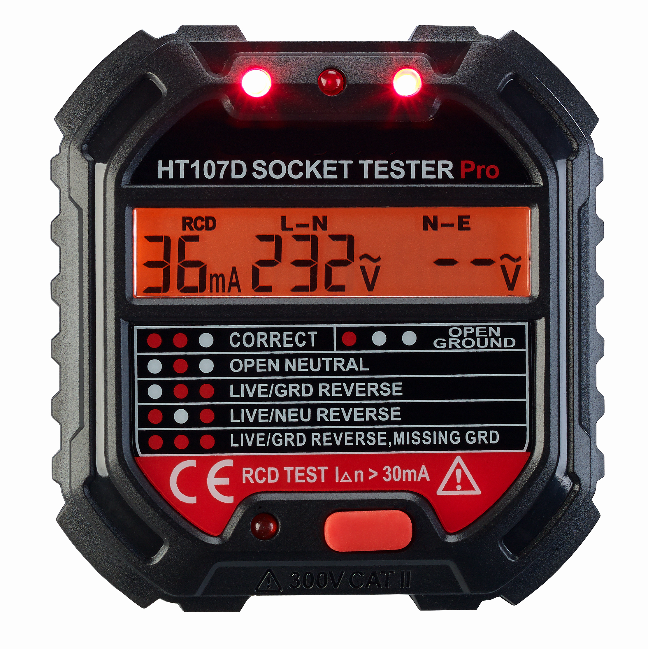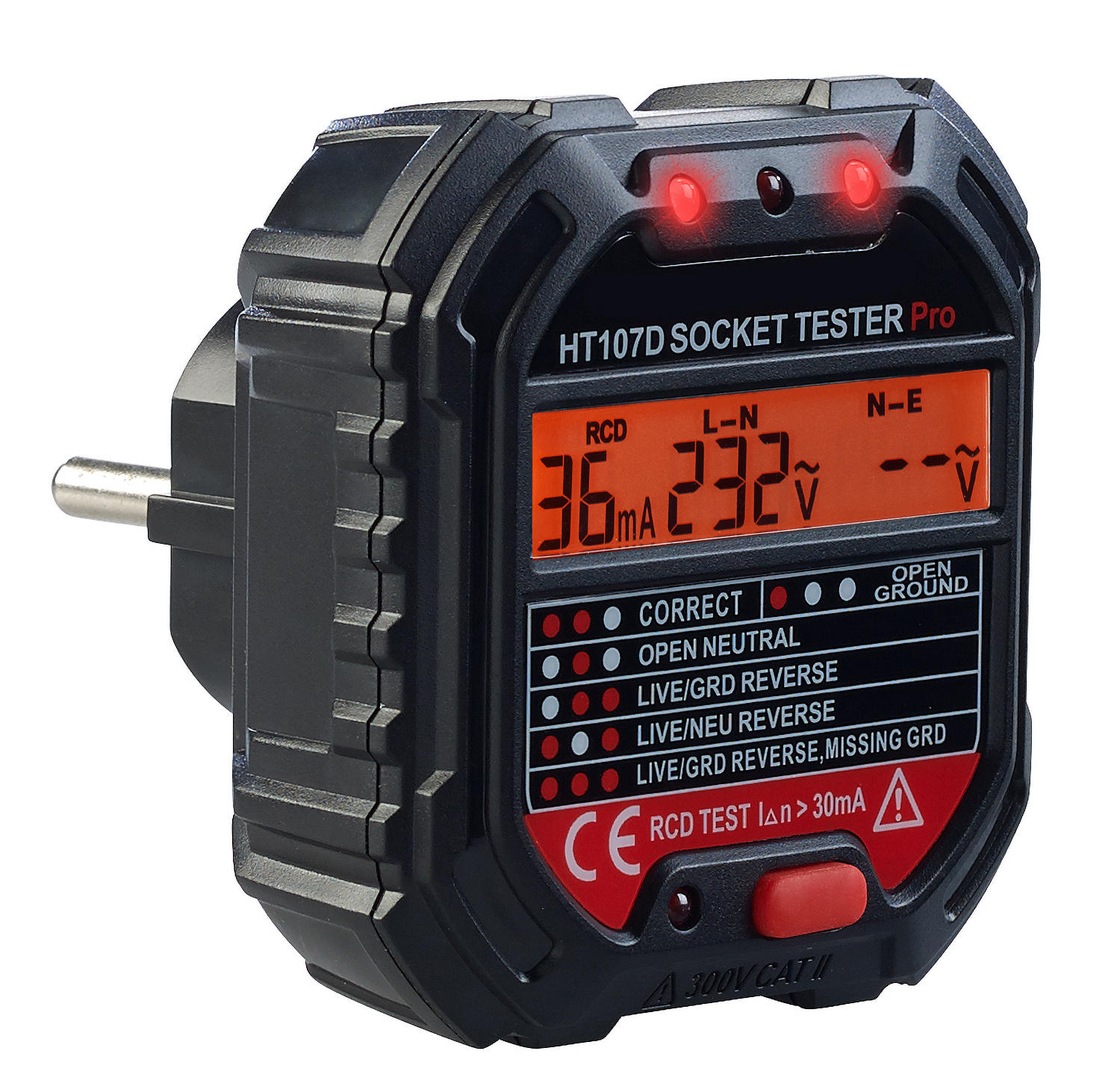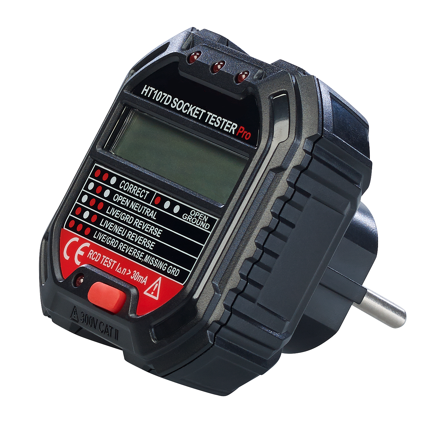 Mit RCD-Test: Per Tastendruck lässt sich zusätzlich prüfen, ob der Fehlerstromschutzschalter (FI) bei einem Auslösestrom ab 30 mA auslöst.