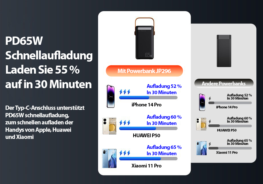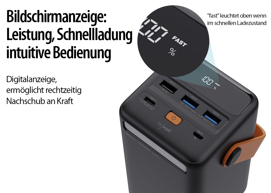 Der mobile Stromspeicher für alle modernen USB-Mobilgeräte mit einer enormen Kapazität von 50.000 mAh! Die Powerbank von revolt unterstützt gleich drei der aktuellsten Schnellladefunktionen: Power Delivery, Super Charge und Quick Charge.