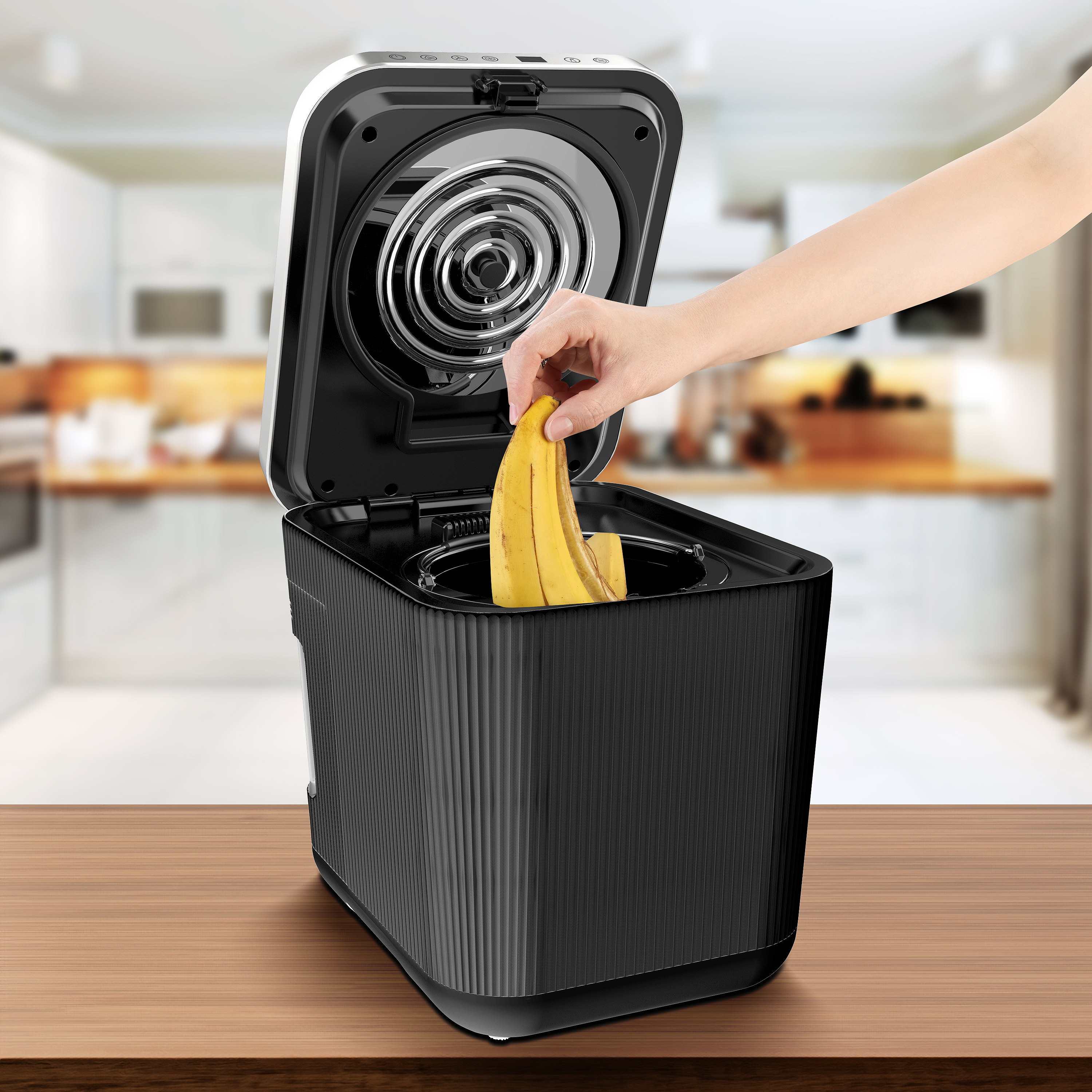 Einfache Bedienung: Speisereste einfüllen, Deckel schließen und per Knopfdruck den Kompostierungsprozess starten. Der Elektro-Komposter trocknet, zerkleinert und kühlt vollautomatisch. Ideal für Obst- und Gemüsereste, Fleisch, Fisch, Brot, Käse und vieles mehr.