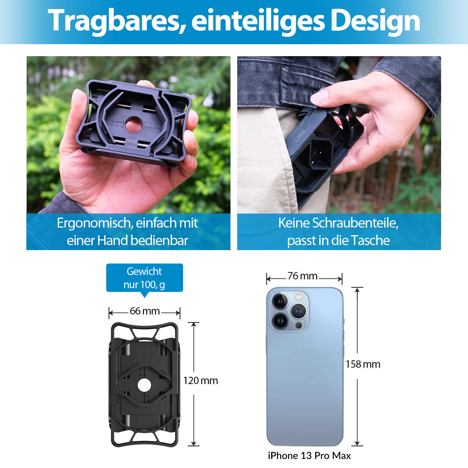Kompatibel mit allen Smartphones: Dank verstellbarer Klemme und Abstandhaltern ist die Universal-Halterung mit allen gängigen Smartphones kompatibel, dabei schnell installiert und im Handumdrehen einsatzbereit.