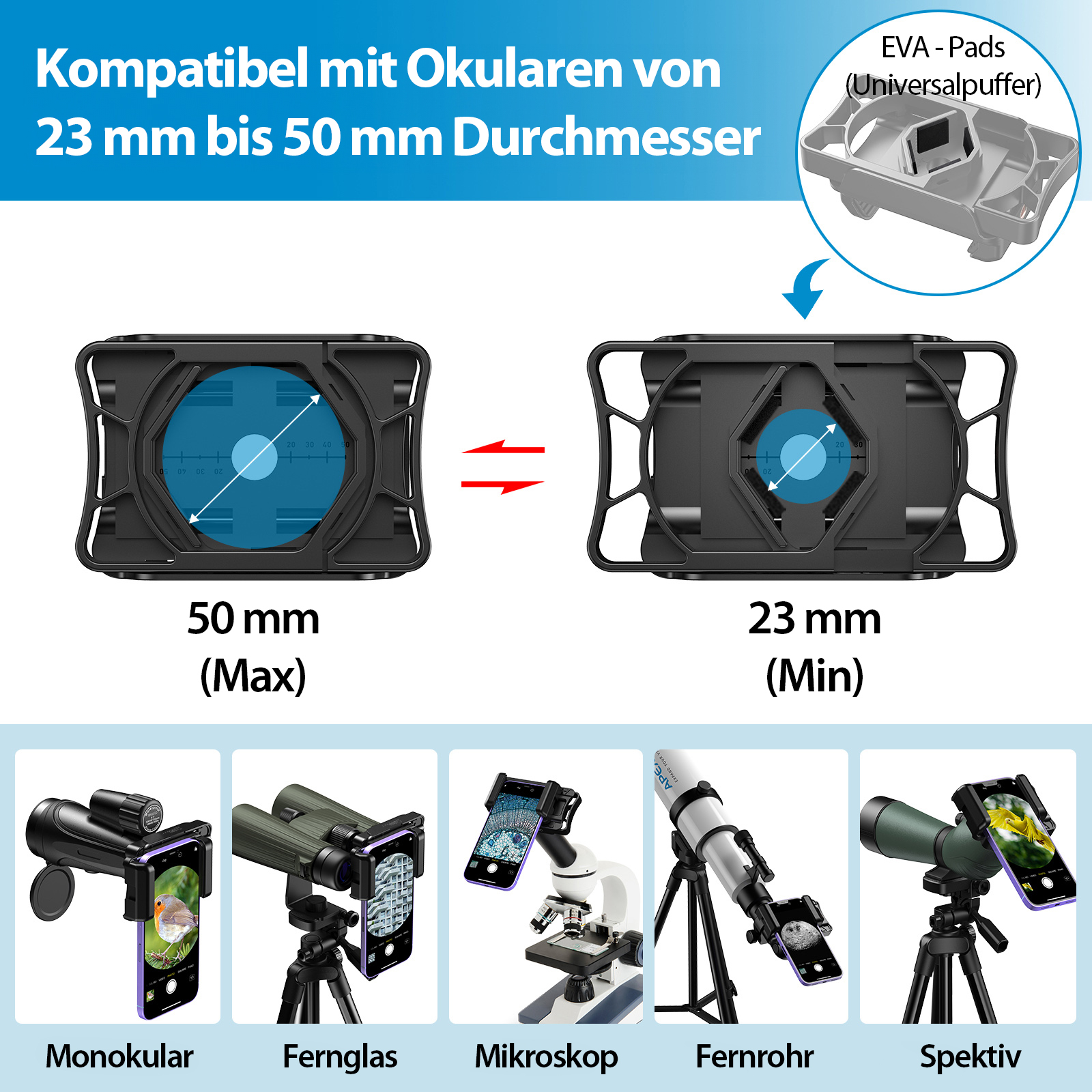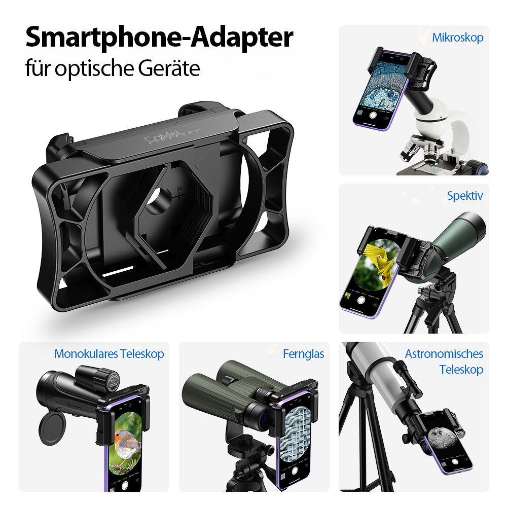 Geeignet für verschiedene Okulare: Mit diesem Smartphone-Halter von Callstel lässt sich das Smartphone in Verbindung mit einem Okular, wie z.B. einem Fernglas, einem Mikroskop oder Teleskop u.v.m. nutzen.