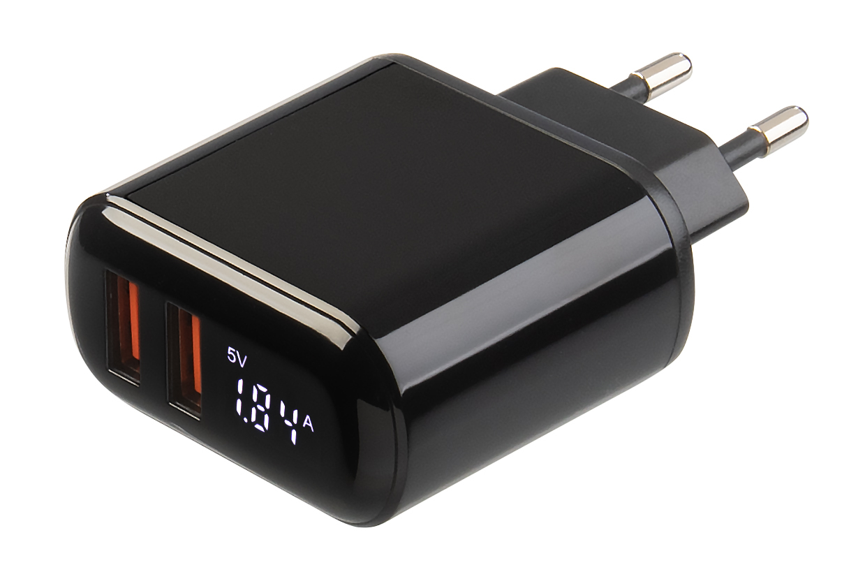 revolt 2-Port-USB-Netzteil mit 2x USB-A, Quick Charge & Display, 18 Watt, schwarz