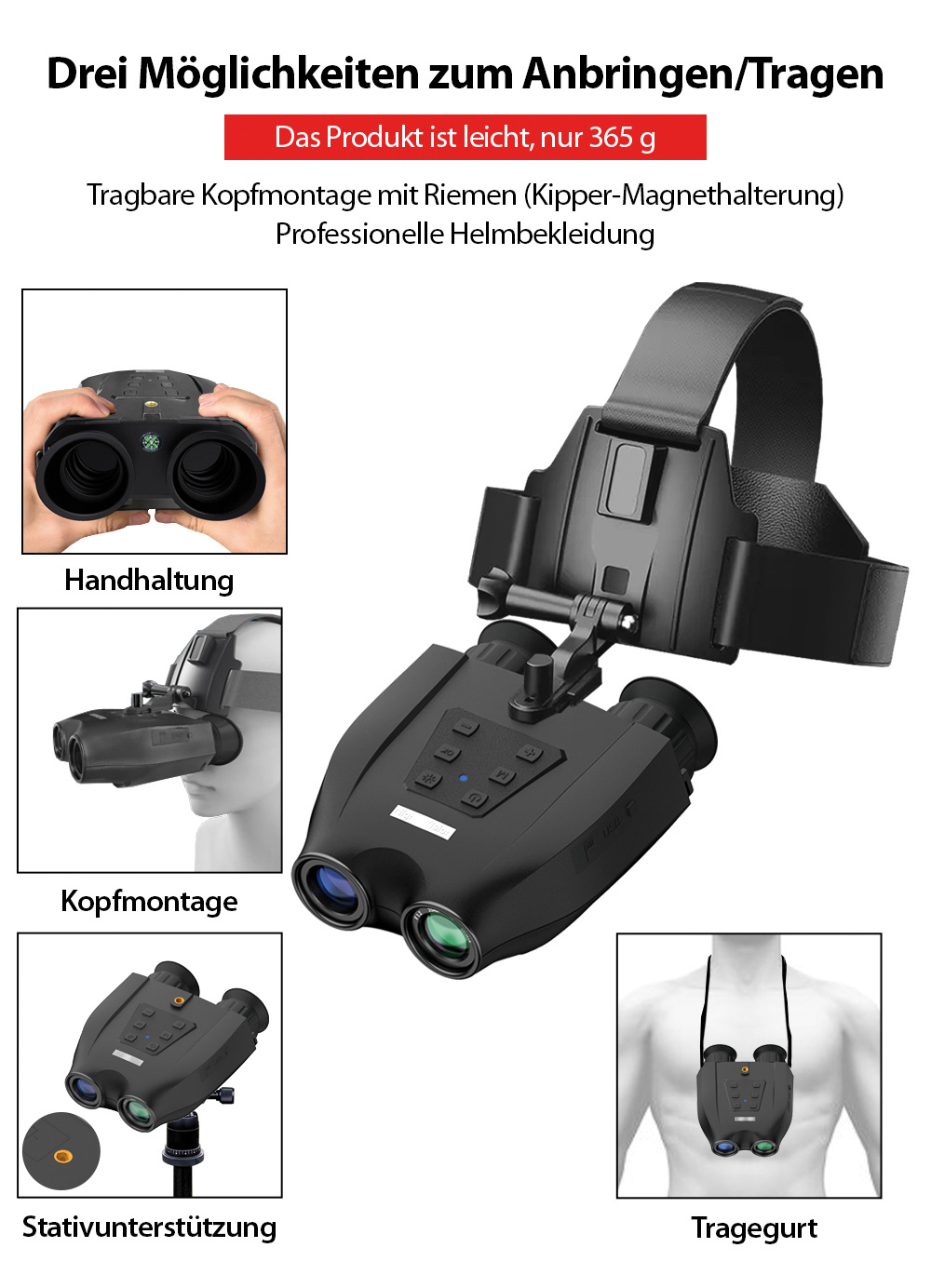 Mit Kopfhalterung: Dank der verstellbaren Kopfhalterung lässt sich das Nachtsichtgerät bequem auf dem Kopf tragen und man hat beide Hände frei. Ideal für unterwegs, in der Natur, beim Radfahren etc.