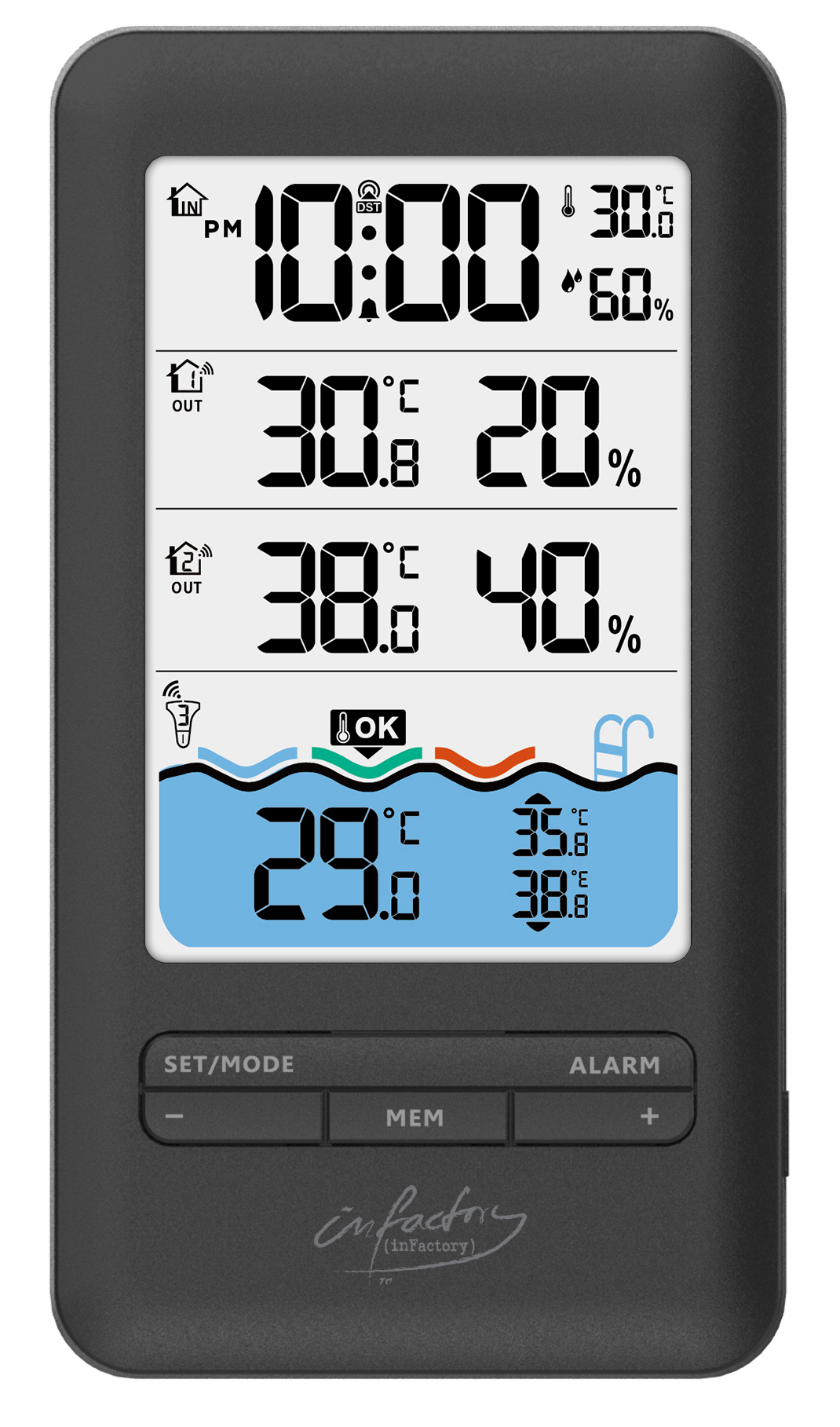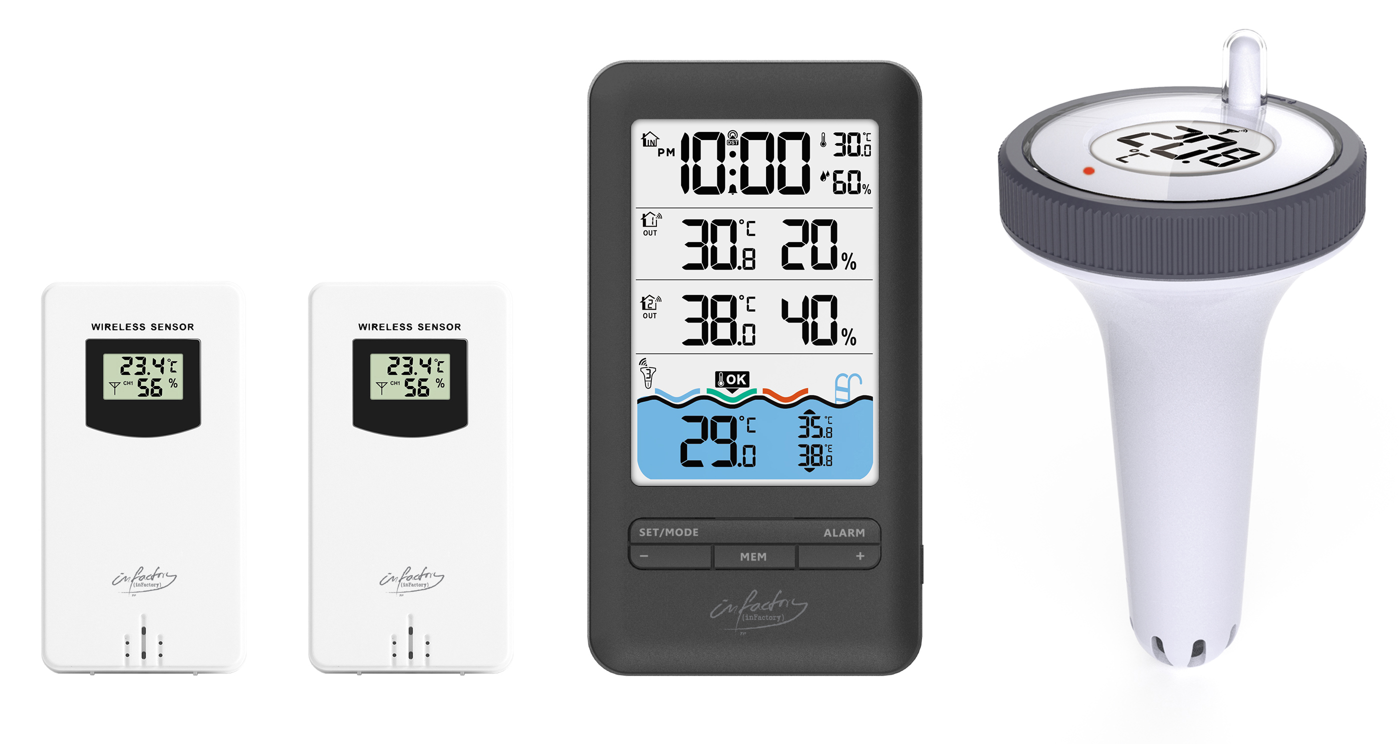 Zwei zusätzliche Außensensoren liefern Informationen über die Außentemperatur und -luftfeuchtigkeit. Diese Sensoren können rund ums Haus in wettergeschützten Bereichen angebracht werden und die Messwerte können sowohl auf der Empfangseinheit als auch auf den Sensoren selbst abgelesen werden, so dass das ideale Badewetter sofort erkennbar ist.