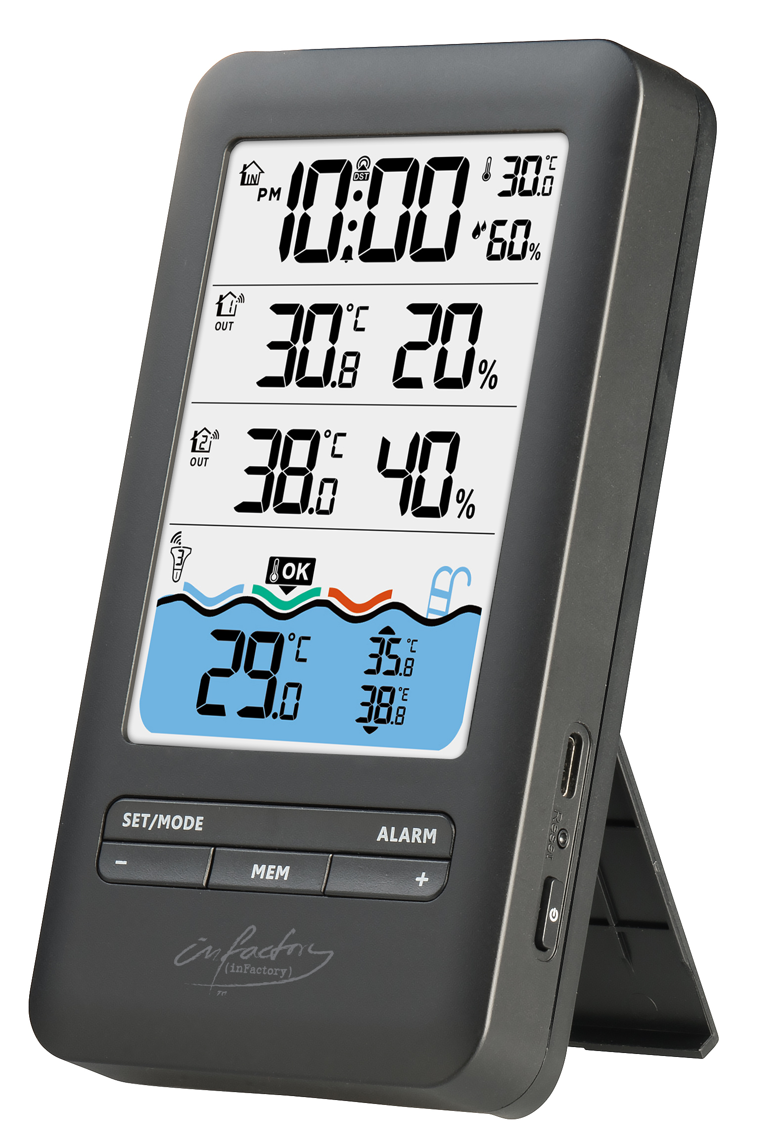 Mit dem Funk-Poolthermometer mit WLAN von infactory hat man die Wassertemperatur im Pool, Gartenteich oder in der Badewanne immer im Blick. Die Temperatur lässt sich mühelos und bequem messen und dank Funkverbindung bequem im Wohnzimmer auf dem LCD-Farbdisplay der Empfangseinheit ablesen. Zusätzlich werden Raumtemperatur, Luftfeuchtigkeit sowie Minimal- und Maximalwerte angezeigt.