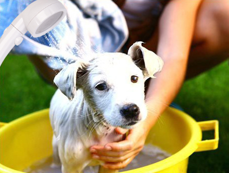 Auch Haustiere profitieren von der Camping-Dusche. Sie eignet sich ideal als Gartendusche, um Sand, Lehm und anderen Schmutz schnell und einfach aus dem Fell des Hundes zu spülen, bevor er abends ins Haus kommt.