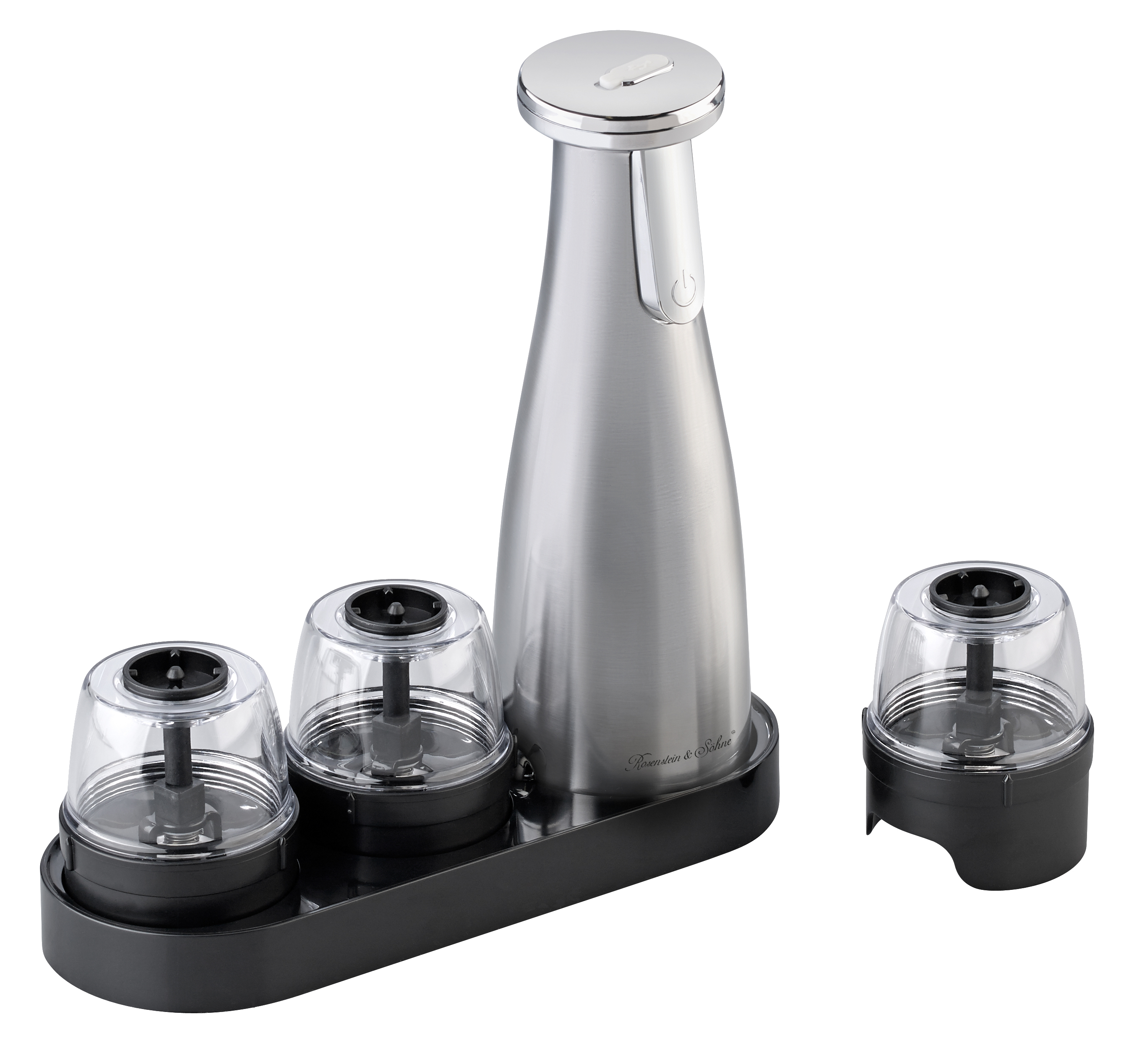 Eine Mühle, drei Gewürze: Die 3 in 1 Akku-Multi-Gewürzmühle von Rosenstein & Söhne kommt mit gleich drei austauschbaren Behältern, je mit eigenem Mahlwerk. Einfach je einen Behälter mit Salz, Pfeffer, Oregano oder anderen getrockneten Gewürzen füllen und in der Tischaufbewahrung auf den Tisch stellen. So kann jeder die Speisen nach seinem Geschmack nachwürzen. Der Austausch der Behälter ist mit einem Handgriff geschehen!