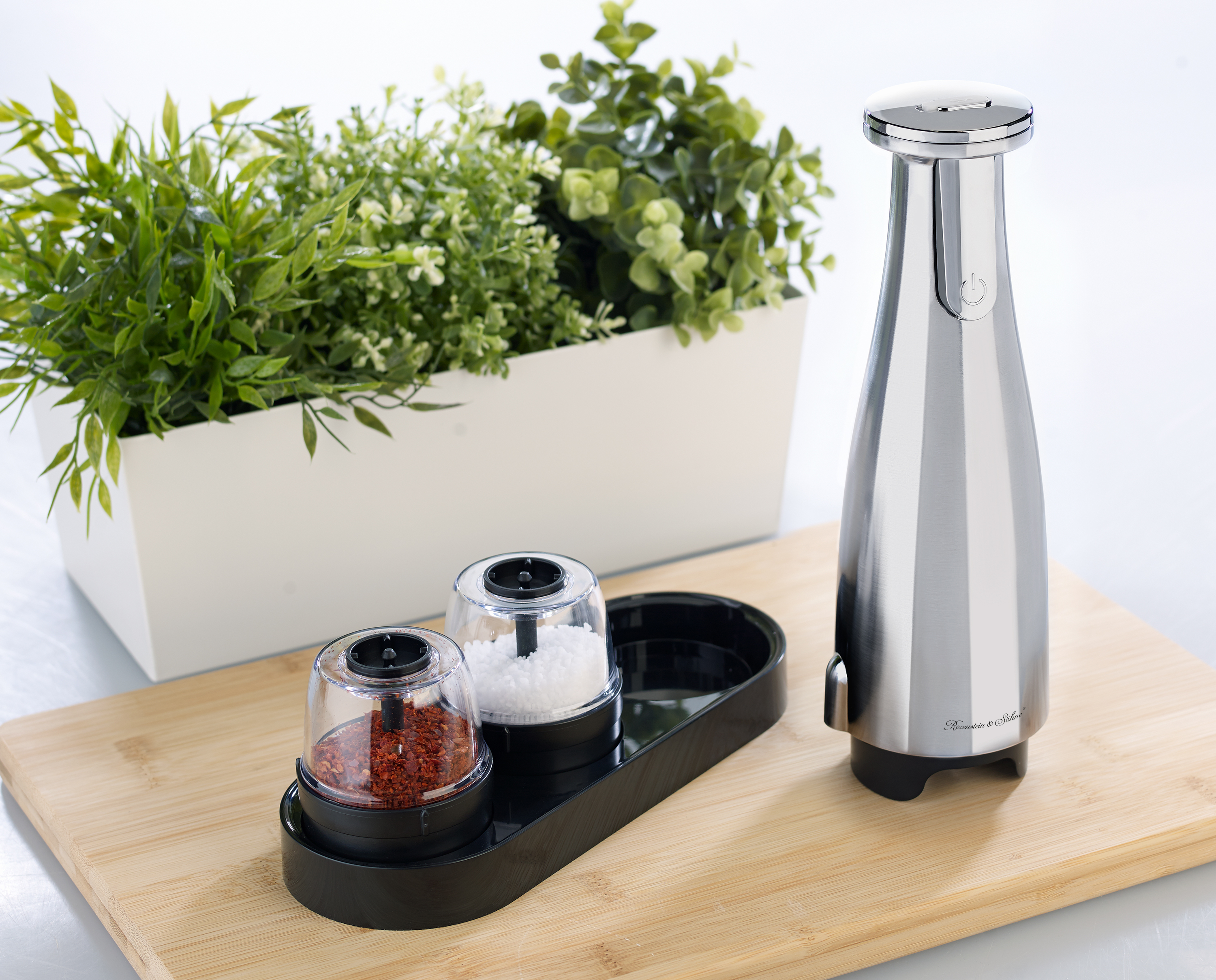 Ein toller Blickfang auf dem Tisch: Die Tischaufsteller lässt das Set nicht nur elegant daherkommen. Es sorgt zudem dafür, dass der Tisch frei von Gewürz-Spuren bleibt und das Set auch einen festen Platz zwischen Speisen und Geschirr hat.
