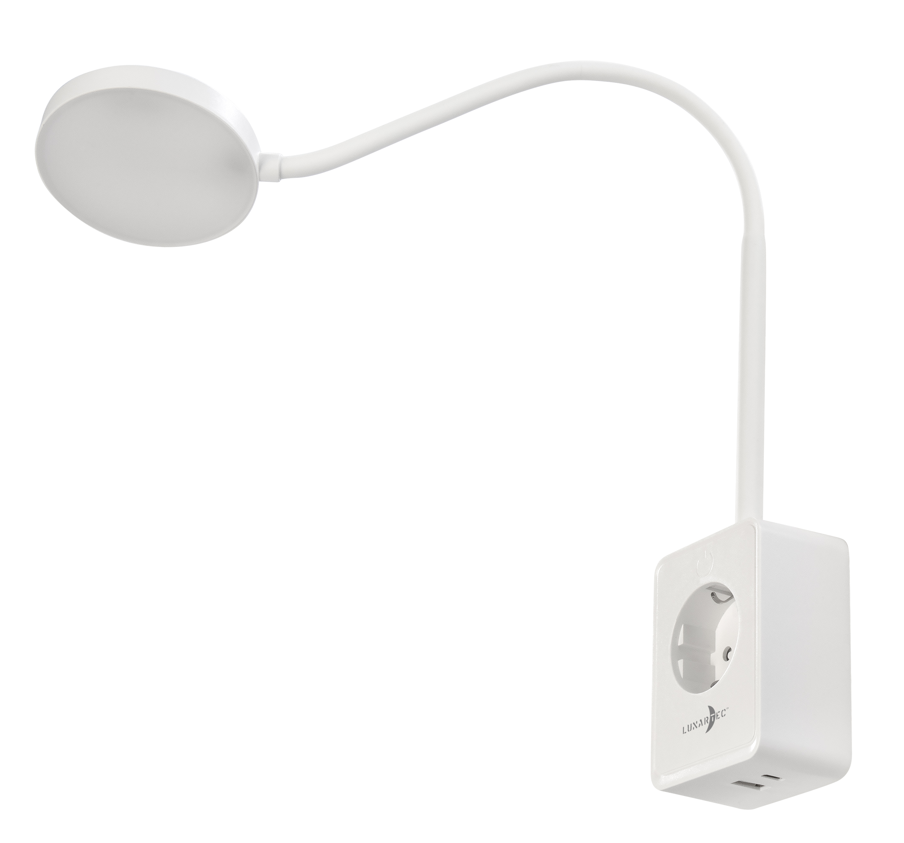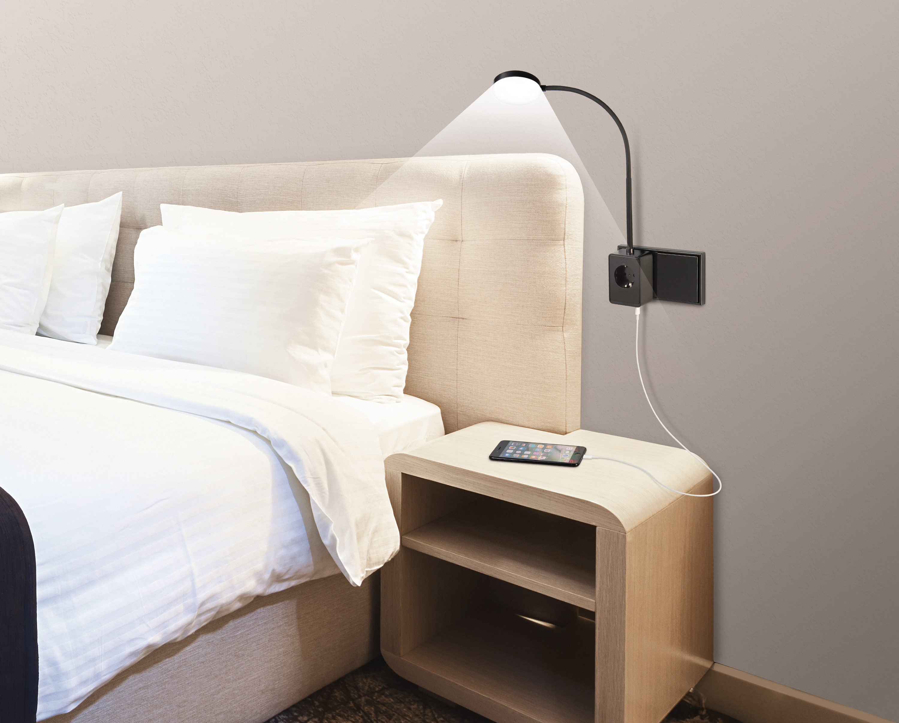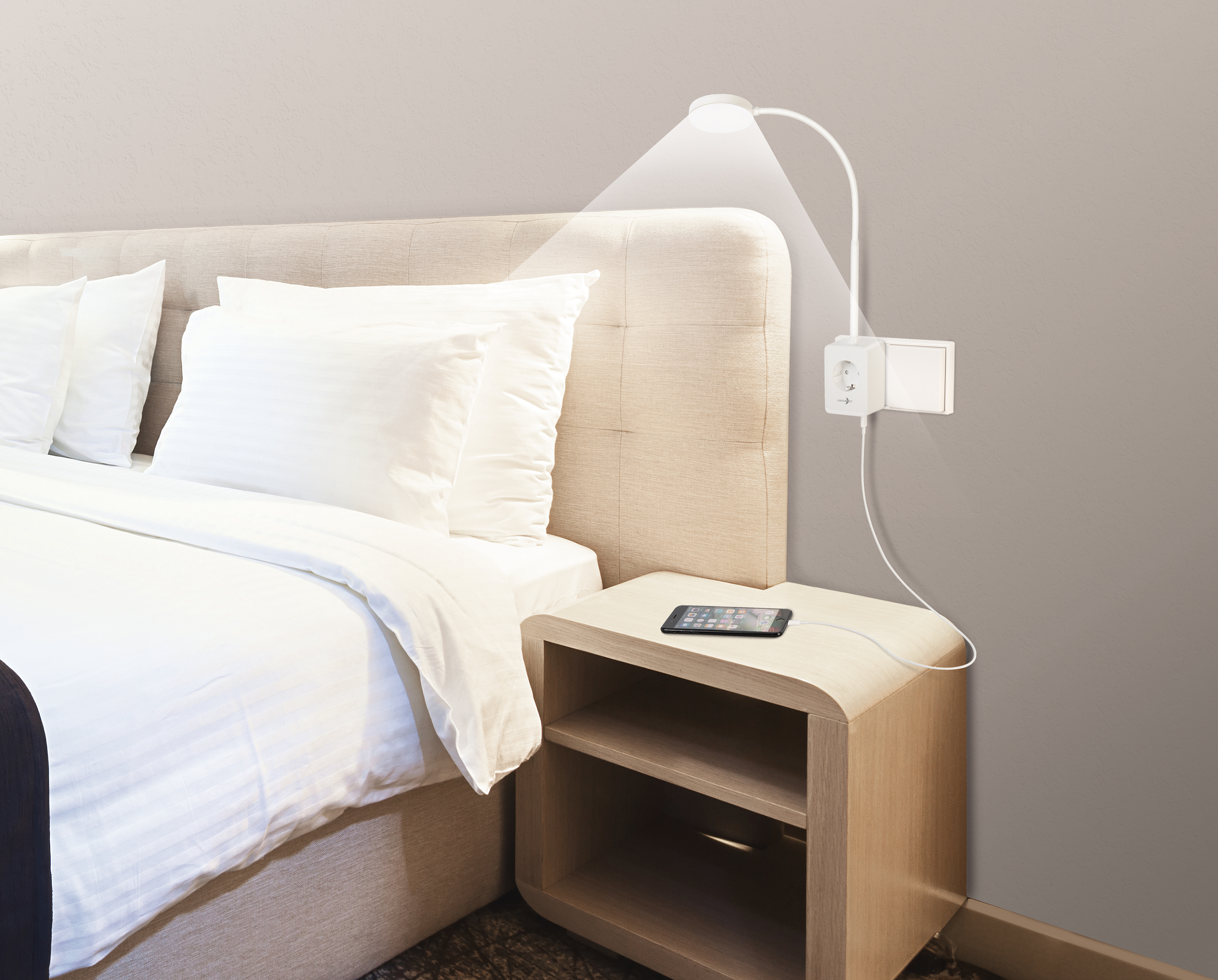 Keine Steckdose blockieren: Dank der durchgeschleiften 230-Volt-Schutzkontaktsteckdose werden Radiowecker oder andere Geräte auch bei eingesteckter Leseleuchte weiter mit Strom versorgt.