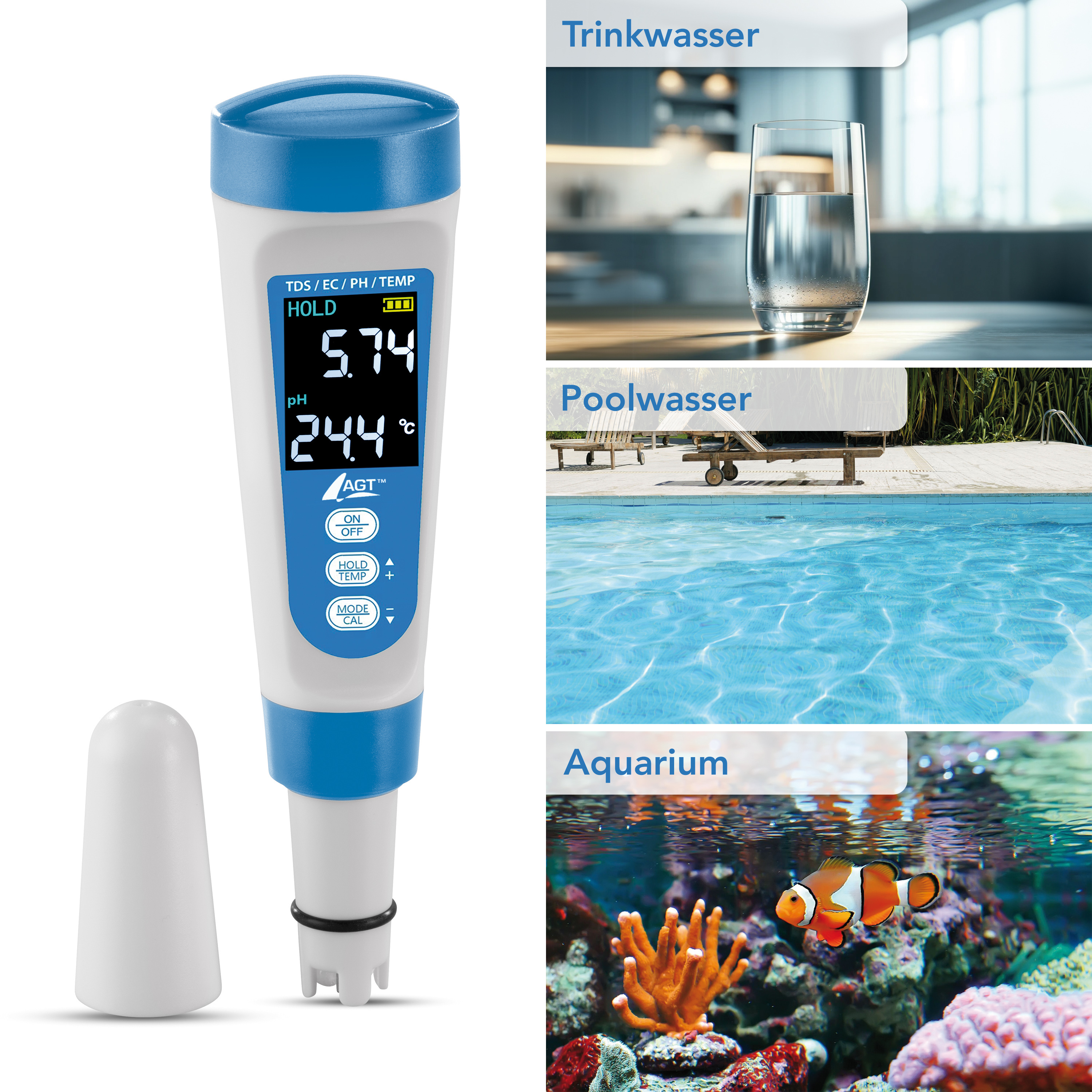 (lifepr) (Buggingen, 02.07.2024) Das digitale 4in1 Wasserqualitätsmessgerät von AGT bietet präzise Wasseranalysen in einem kompakten Gerät. Mit benutzerfreundlichem LCD-Display und robustem IP55-Schutz misst es zuverlässig pH-Wert, Leitfähigkeit, TDS und Temperatur. Ideal für Aquarien, Swimmingpools oder zur Kontrolle von Trinkwasser, sorgt es für perfekte Wasserqualität auf Knopfdruck.