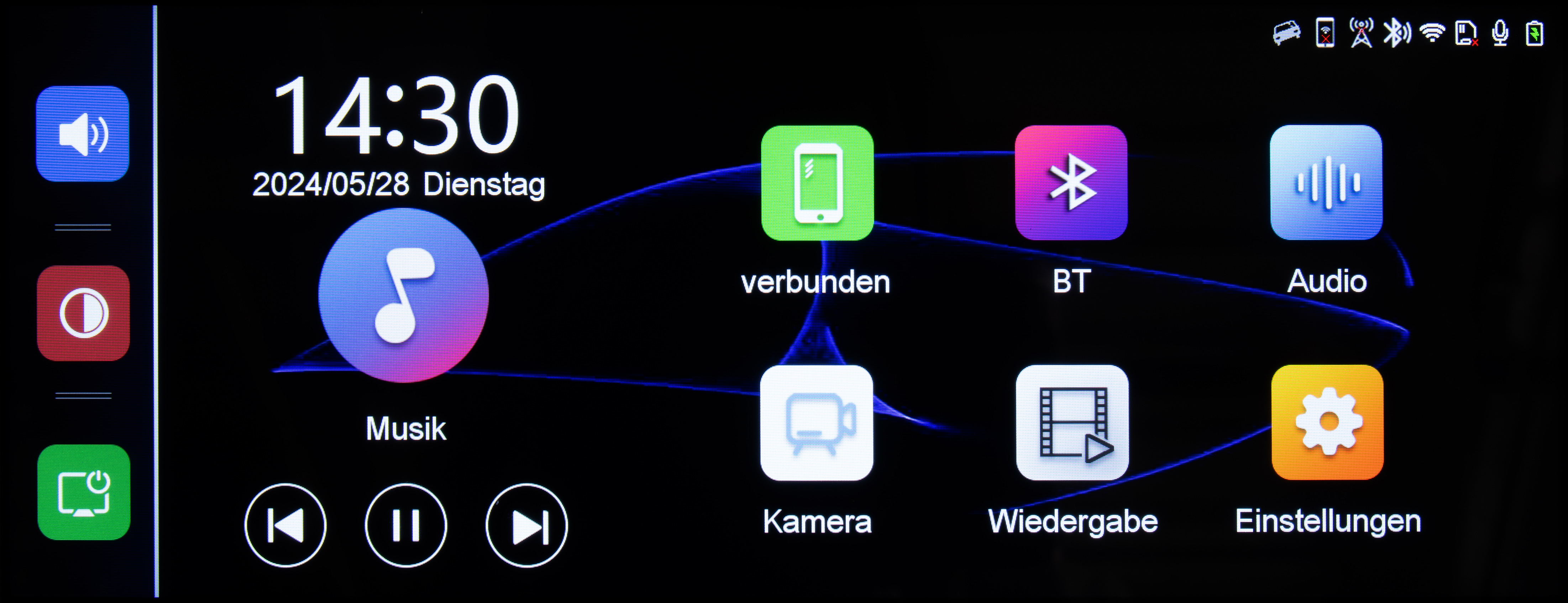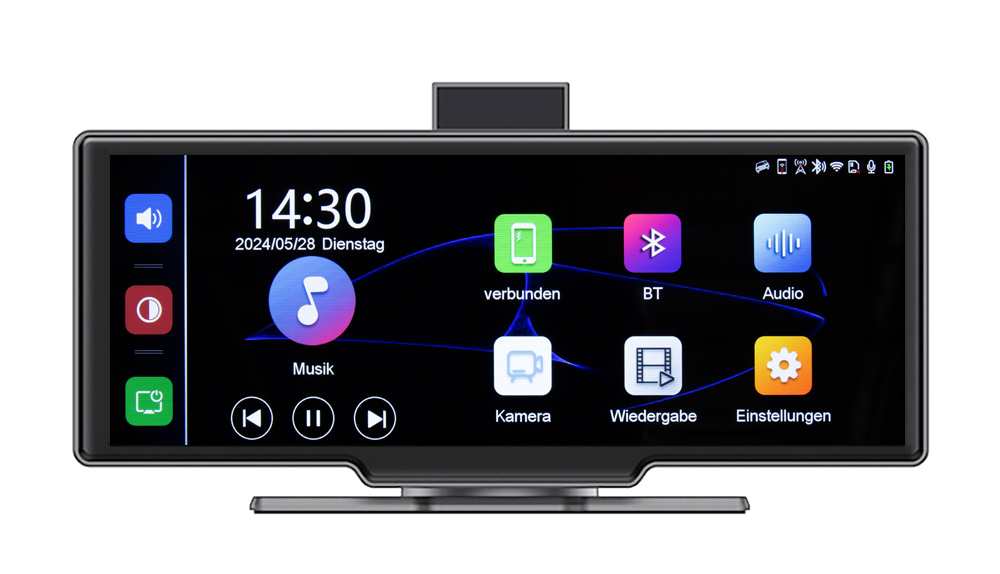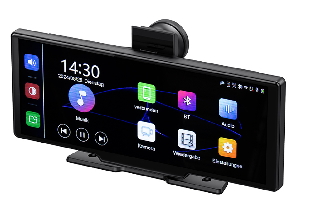 Der Monitor überträgt Musik per Bluetooth oder FM-Transmitter an das Autoradio und ermöglicht so eine kabellose Musikübertragung. Optional kann der Monitor auch über ein AUX-Kabel mit dem Autoradio verbunden werden. Zusätzlich lassen sich Musiktitel von einer microSD-Speicherkarte abspielen.