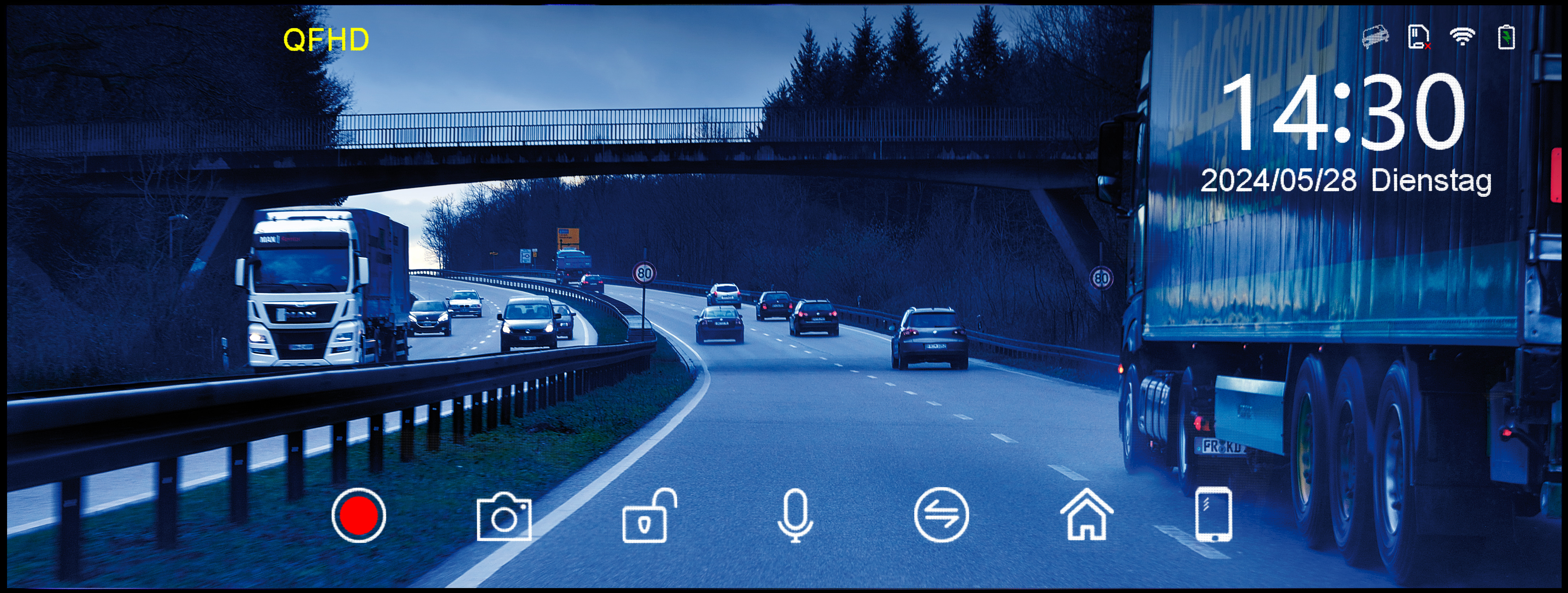 Mit der integrierten Frontkamera kann die Fahrt in hoher 2K-Auflösung aufgezeichnet werden. Diese Dashcam-Funktion bietet zusätzliche Sicherheit, indem brenzlige Situationen im Straßenverkehr dokumentiert werden. Optional kann der Monitor um eine Rückfahrkamera erweitert werden und somit als Einparkhilfe dienen.