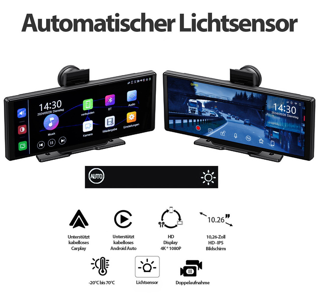 Der Carplay-Wireless-IPS-HD-Touchscreen mit Frontkamera von Lescars bietet die Möglichkeit, iPhones und Android-Smartphones per Bluetooth zu verbinden und so Apple CarPlay oder Android Auto zu nutzen. So können Apps direkt im Auto genutzt werden, zum Beispiel Navigations-Apps auf dem großen Display des Monitors oder Sprachassistenten wie Siri.