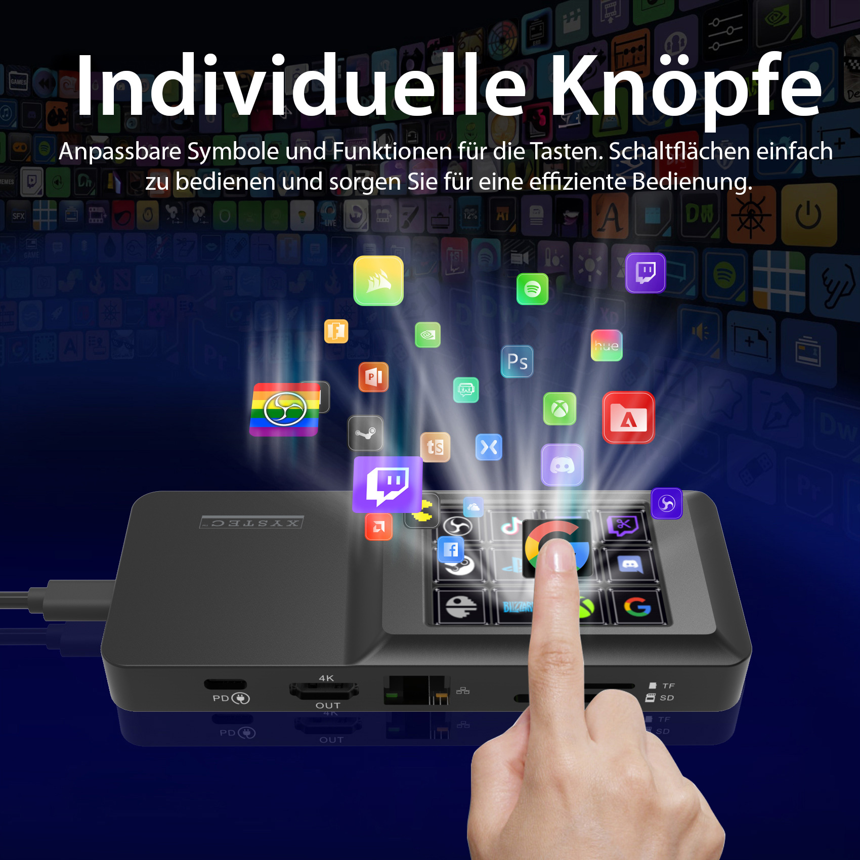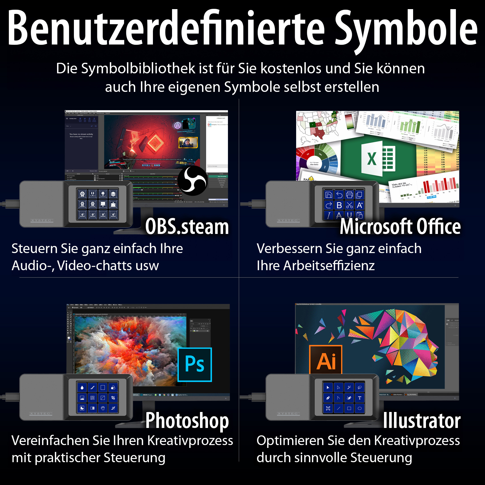 Der Software-Controller mit Display von Xystec ermöglicht über 12 programmiere Shortcuts die einfache Steuerung von Anwendungen und Software. Per USB-Verbindung zum Laptop oder PC und die Steuerung über den Touchscreen können zahlreiche Anwendungen effizienter genutzt und die Produktivität gesteigert werden.
