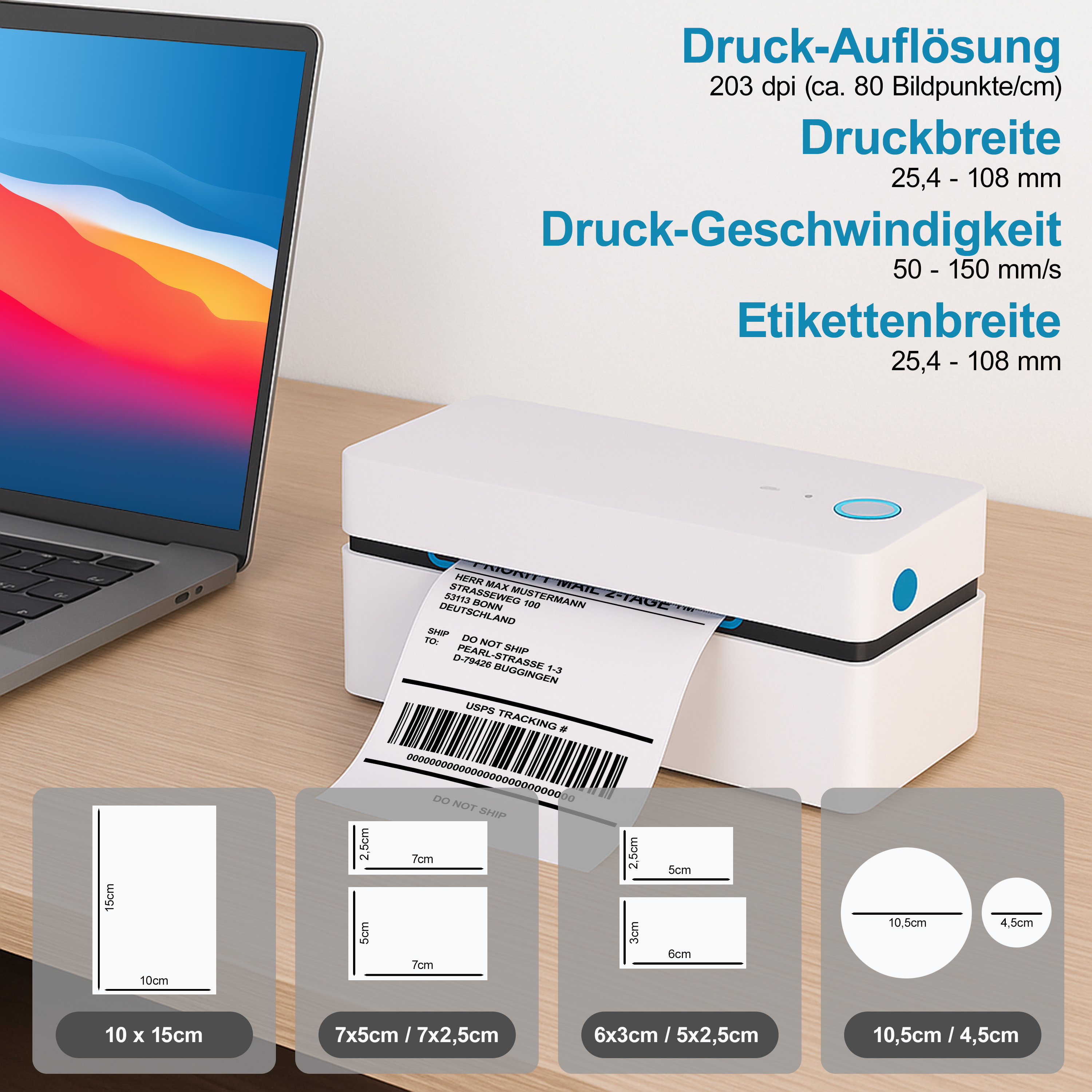 Callstel Etiketten-Thermodrucker TD-350.app, 100x150 mm Etiketten, 203 dpi, USB, BT, App