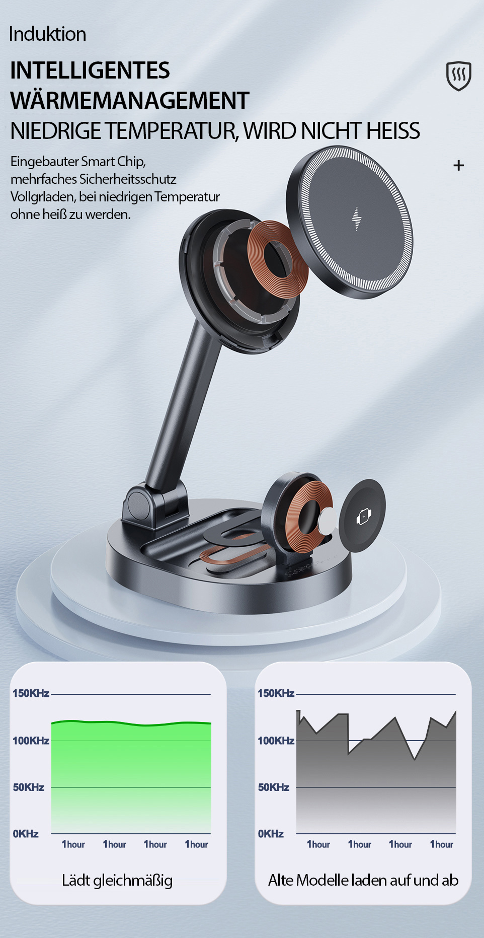 Kompaktes und praktisches Design: Das faltbare Design der Ladestation ermöglicht eine einfache Handhabung und Aufbewahrung, ideal für den Einsatz unterwegs oder am Arbeitsplatz.