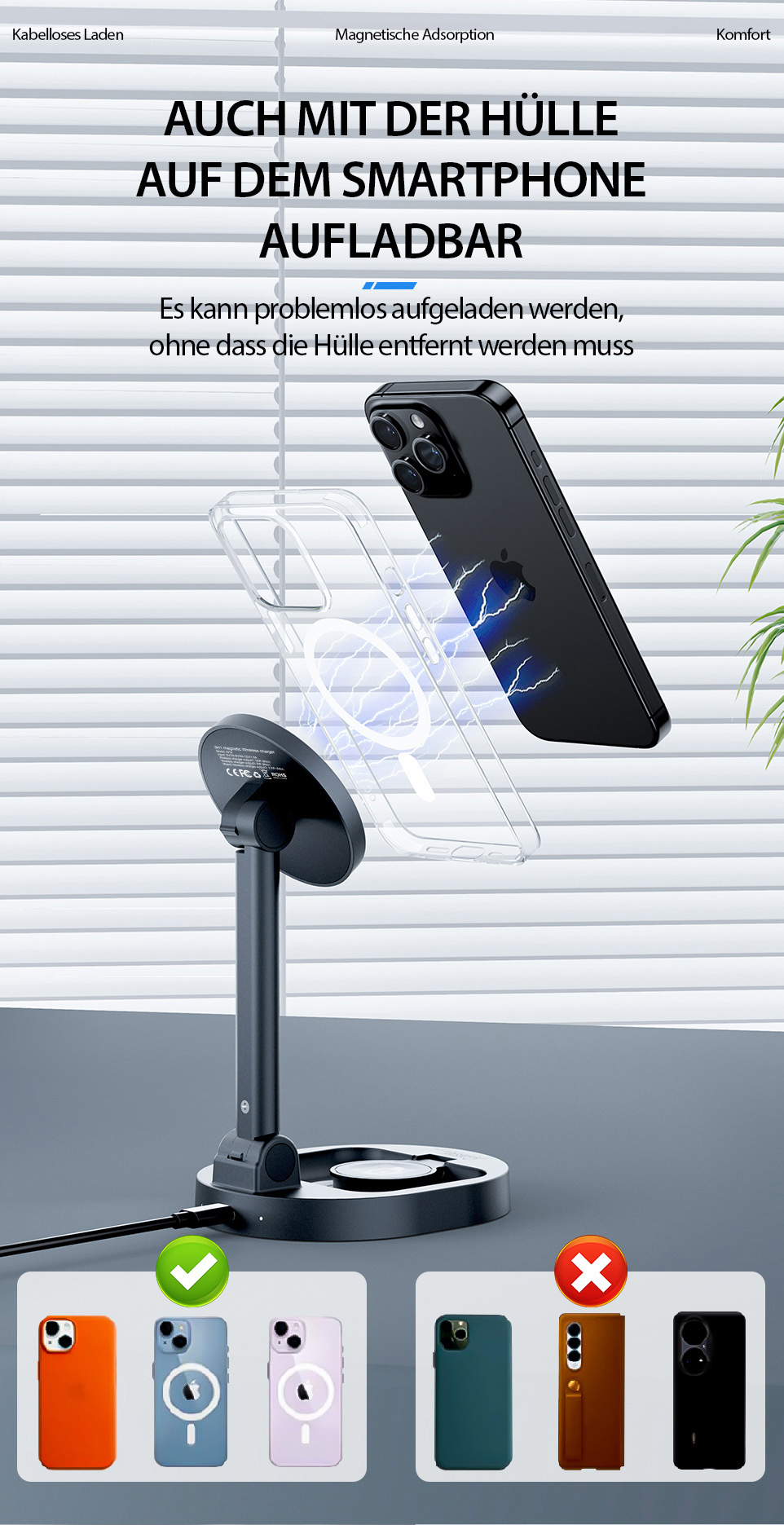 Hohe Ladegeschwindigkeit: Mit einer Ladeleistung von 15 Watt für Smartphones, 5 Watt für AirPods und 2,5 Watt für die Apple Watch sorgt die Ladestation für schnelles und effizientes Aufladen.