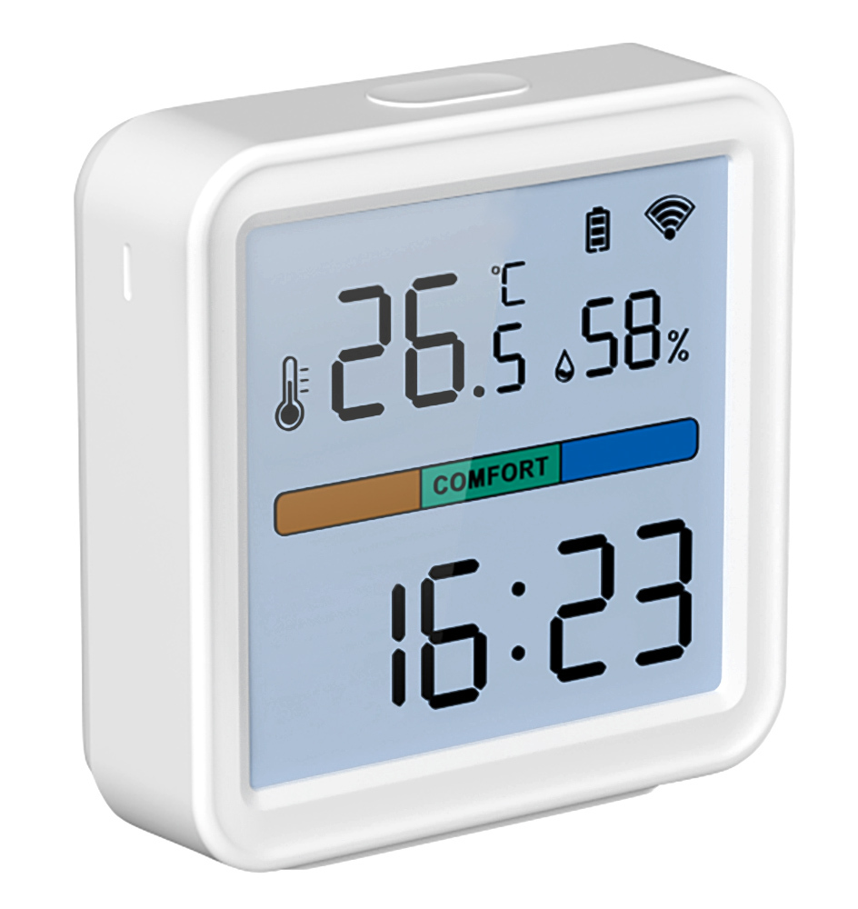 Das Hygrometer verfügt über eine Komfortzonenanzeige, die auf einen Blick erkennen lässt, ob die Raumluft zu feucht, zu trocken oder im idealen Bereich ist.