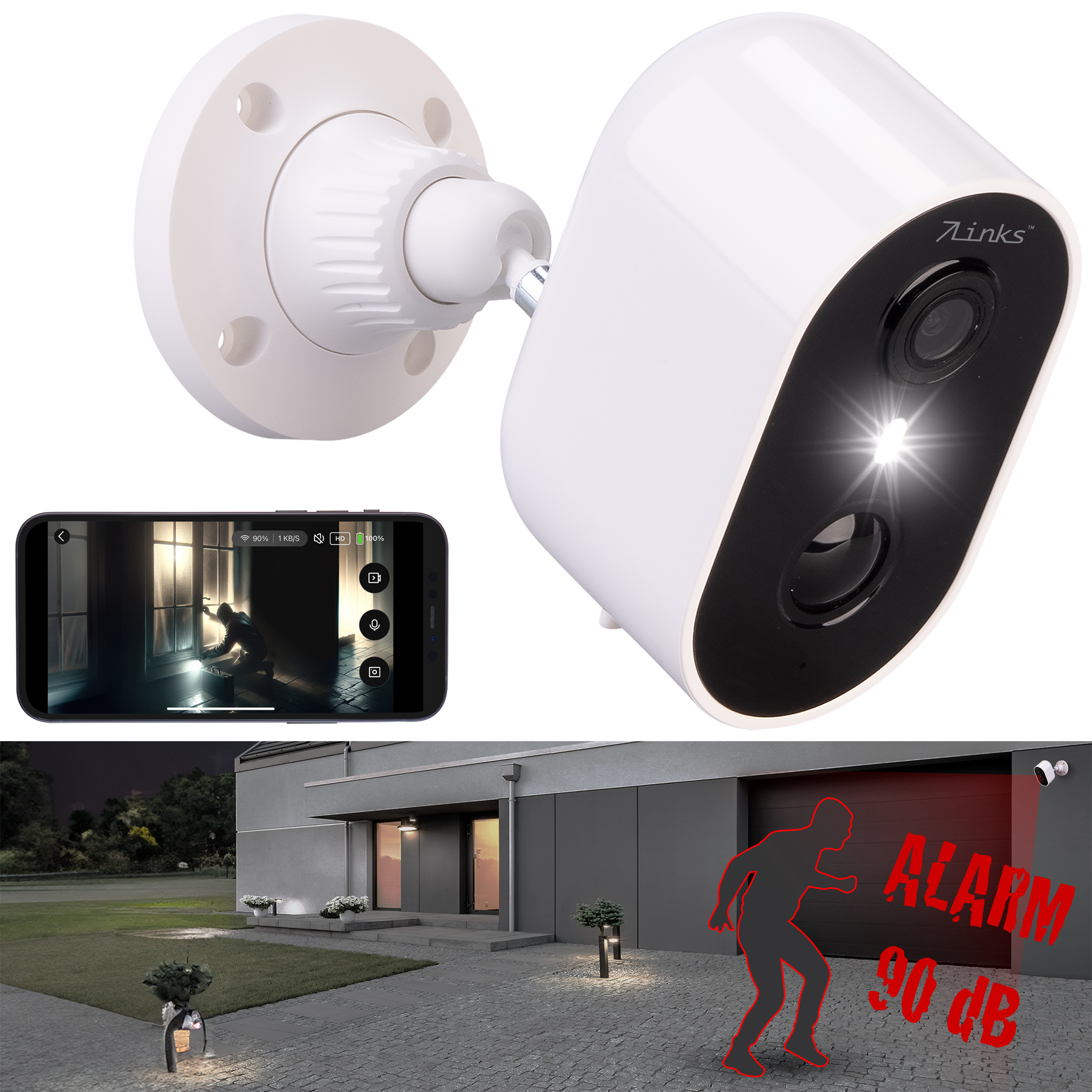 Zur Abschreckung von Eindringlingen ist die Kamera mit einem Sirenenalarm ausgestattet, der im Alarmfall einen 90 dB lauten Ton auslöst. Dieser schrille Alarm schreckt nicht nur Einbrecher ab, sondern macht auch die Nachbarschaft aufmerksam. Über die App kann der Alarm automatisiert ausgelöst werden, zum Beispiel bei Bewegungserkennung.