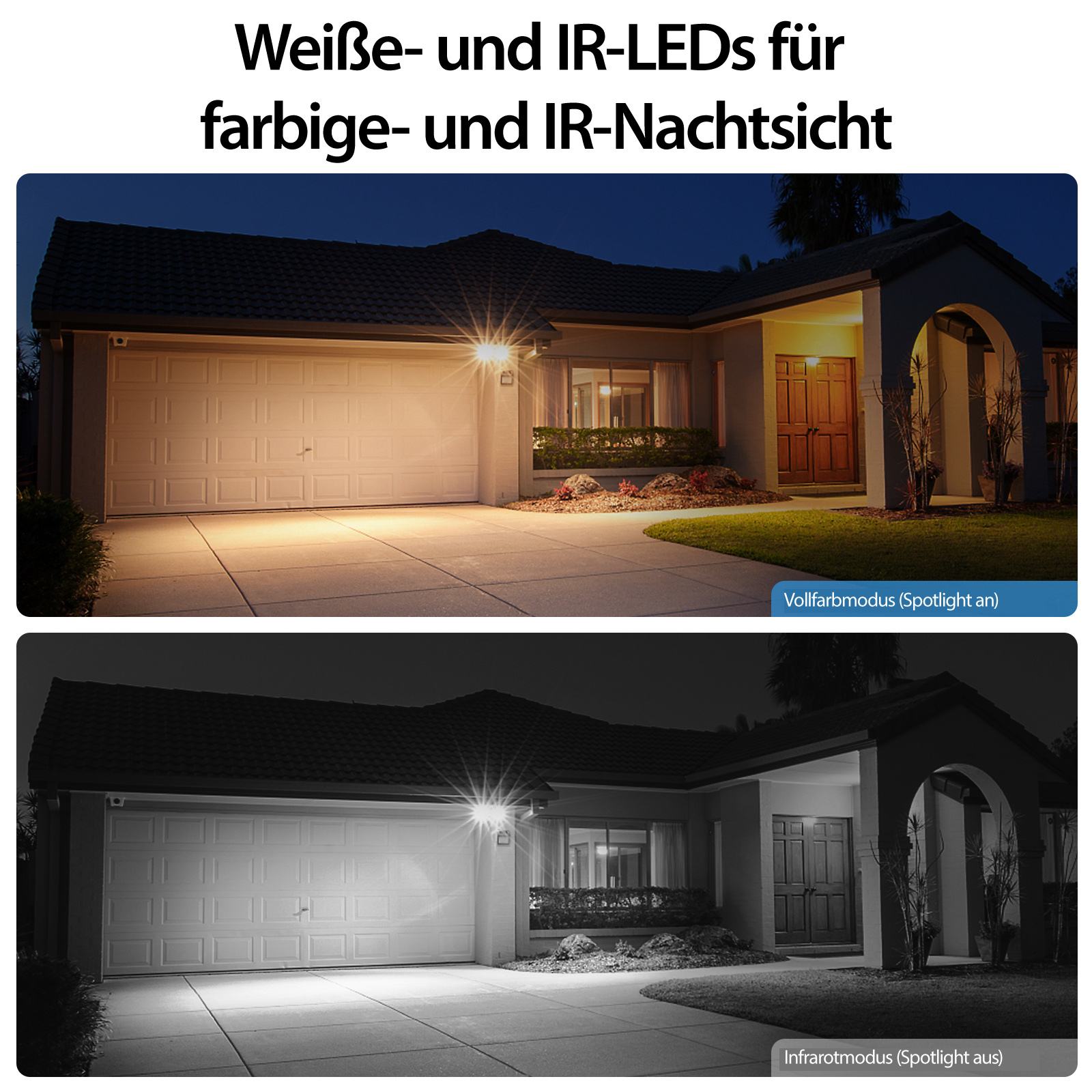 Dank integrierter weißer LEDs liefert die Kamera auch bei Dunkelheit farbige Bilder. Alternativ steht eine Infrarot-Nachtsicht zur Verfügung, die bei Bedarf kontrastreiche Schwarz-Weiß-Bilder liefert.