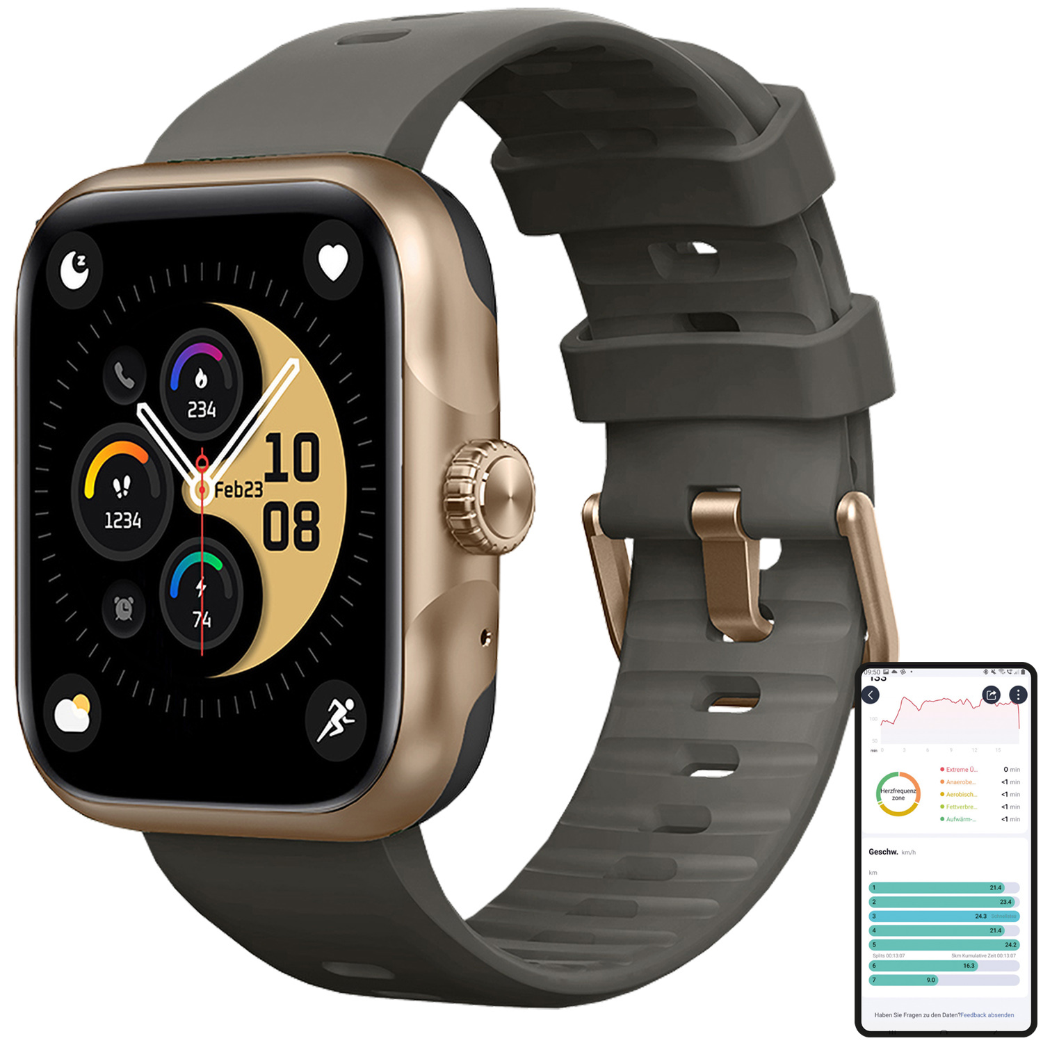 Die Fitness-Smartwatch mit GPS, Herzfrequenzs- und SpO2-Sensor von newgen medicals verfügt über ein schwarzes Aluminiumgehäuse mit mattgoldenem Rahmen. Die hochwertigen Materialien werden mit einem 1,78 Zoll großen AMOLED-Touch-Farbdisplay kombiniert, das eine Auflösung von 368 x 448 Pixeln bietet. Auf Wunsch kann das Display dauerhaft eingeschaltet bleiben, so dass Informationen wie die Uhrzeit immer sichtbar sind. Zur individuellen Gestaltung stehen verschiedene Watchfaces zur Verfügung.