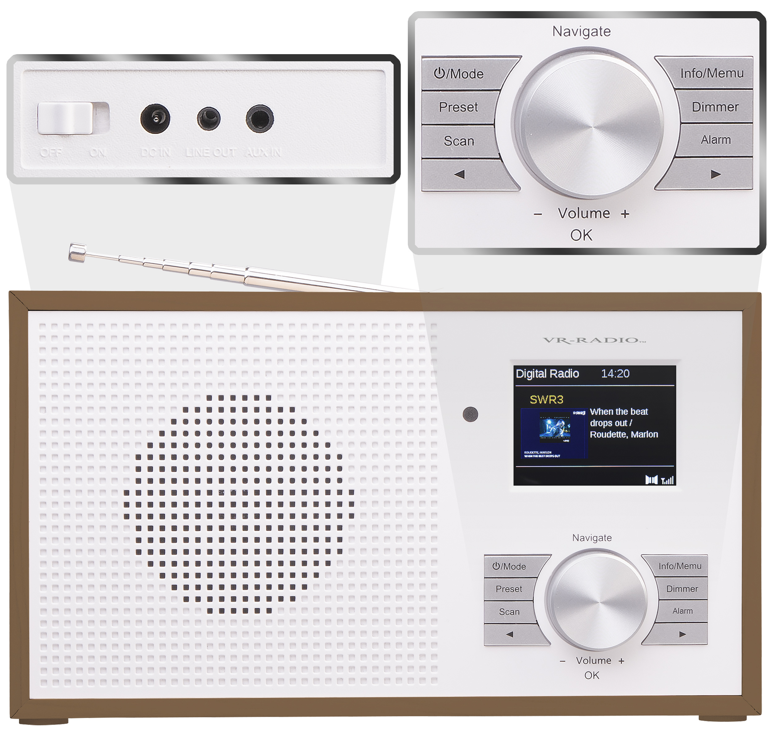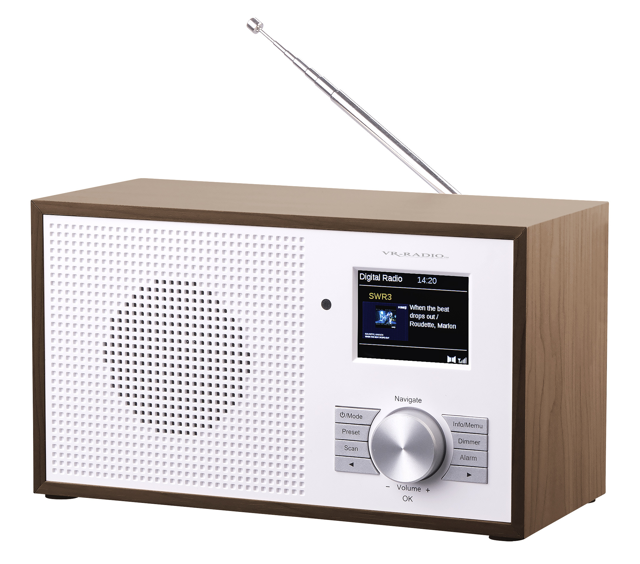 Das DAB+ Radio im nostalgischen Retro-Design in Walnuss-Optik von VR-Radio verbindet klassische Ästhetik mit modernster Technik. Das Gerät vereint ein hochwertiges Äußeres mit einem leistungsstarken Innenleben, das für hervorragenden Klang und umfangreiche Funktionen steht. Ein integriertes Farbdisplay stellt wichtige Informationen wie Sendername, Titel und Interpret übersichtlich dar.