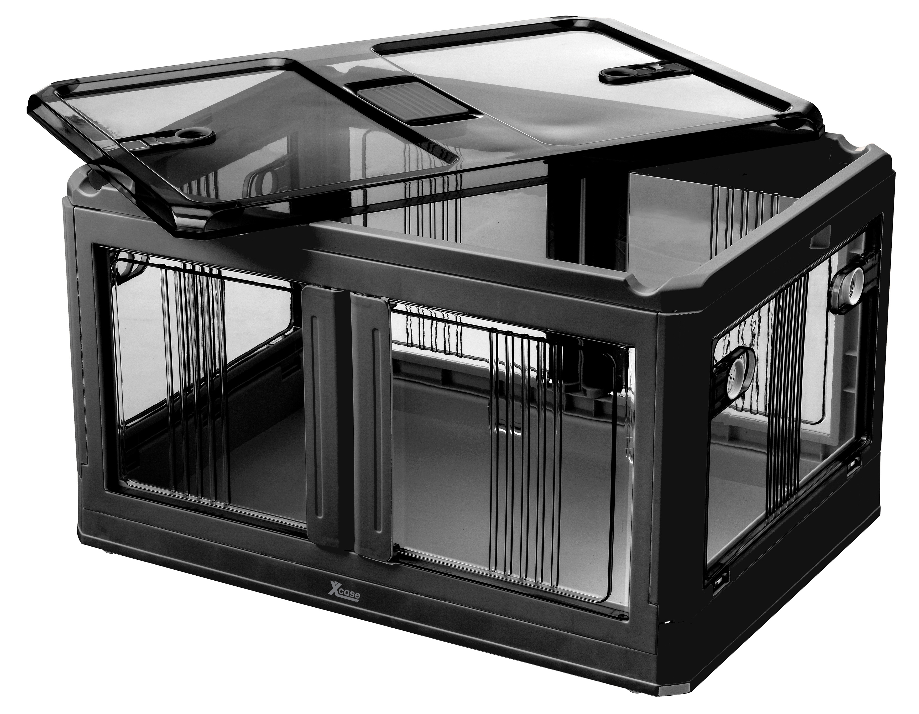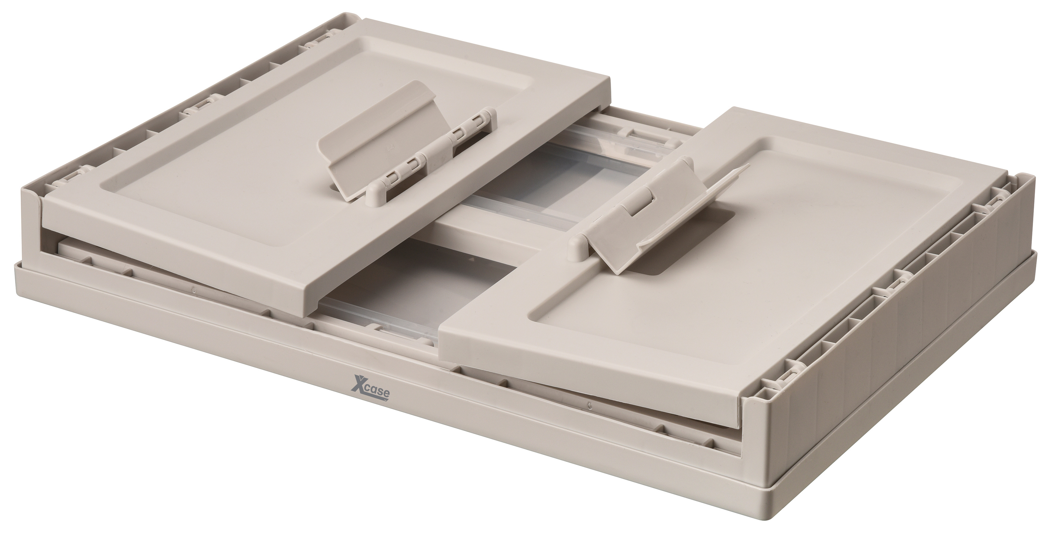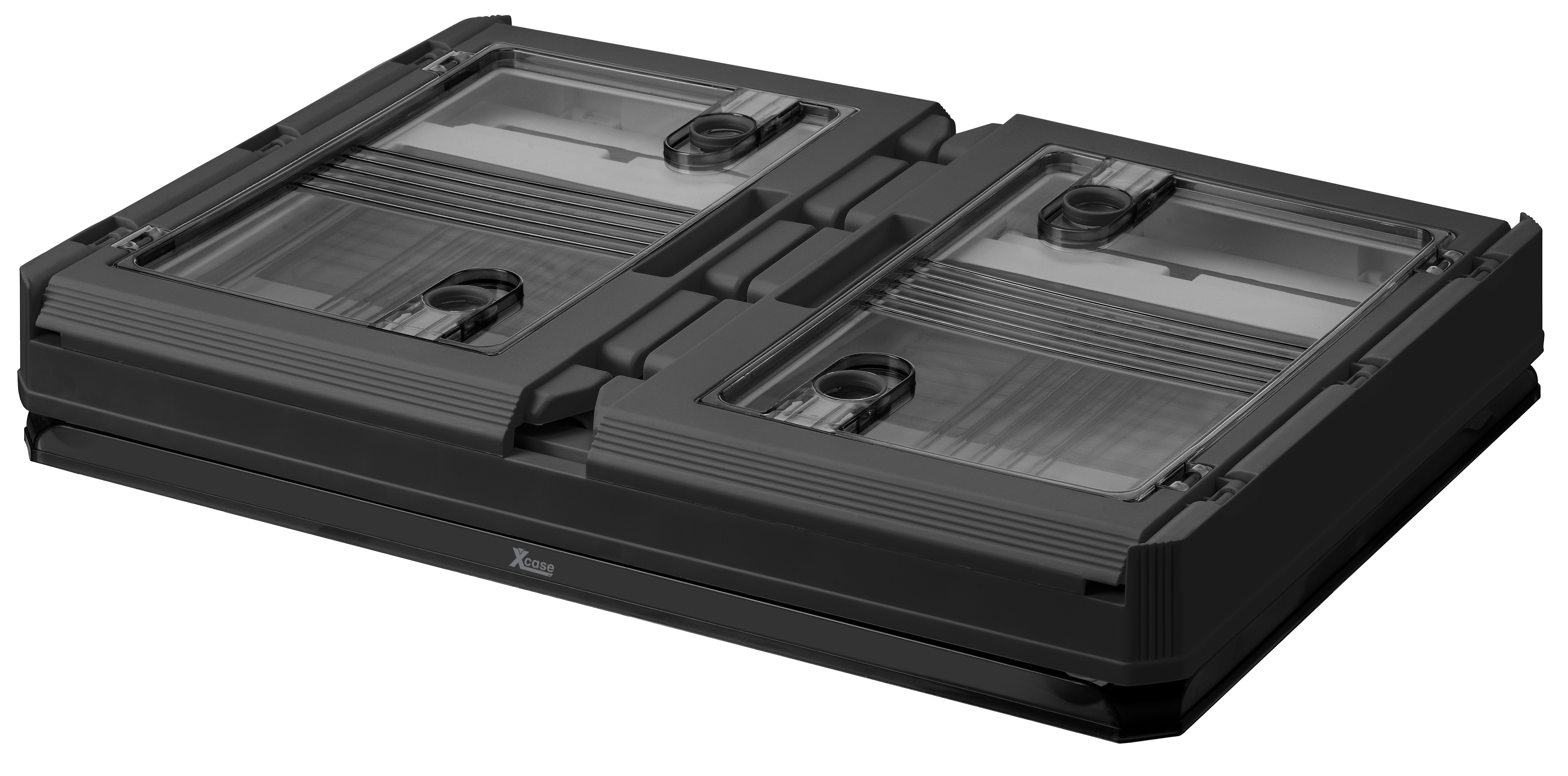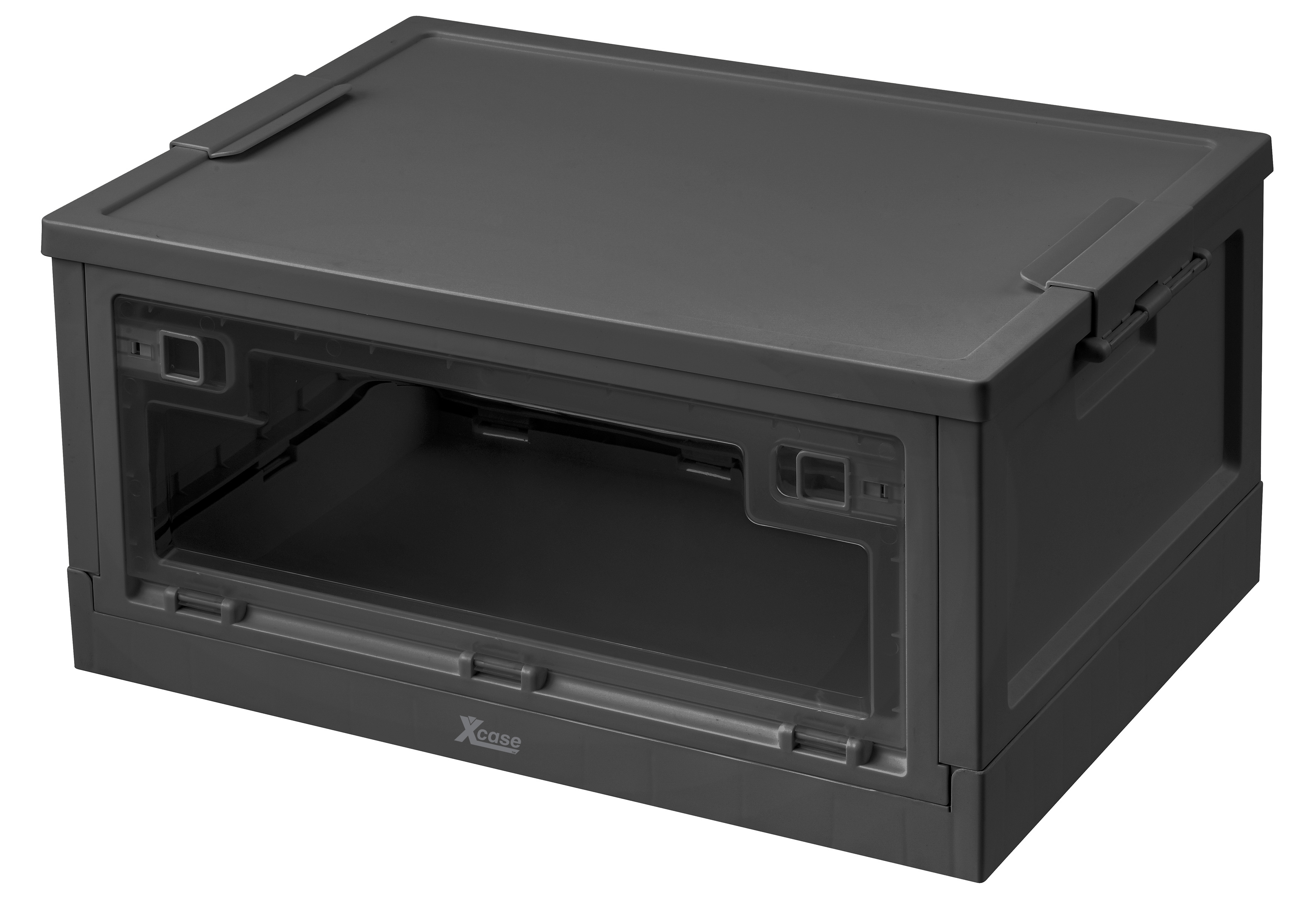 Das Aufbewahrungssystem von Xcase besteht aus stapelbaren Klappboxen mit Deckel zur systematischen Organisation von Werkzeug, Kabeln oder Kleidung. Die Boxen verfügen über seitliche Zugriffsklappen, die den Inhalt auch im gestapelten Zustand zugänglich machen.