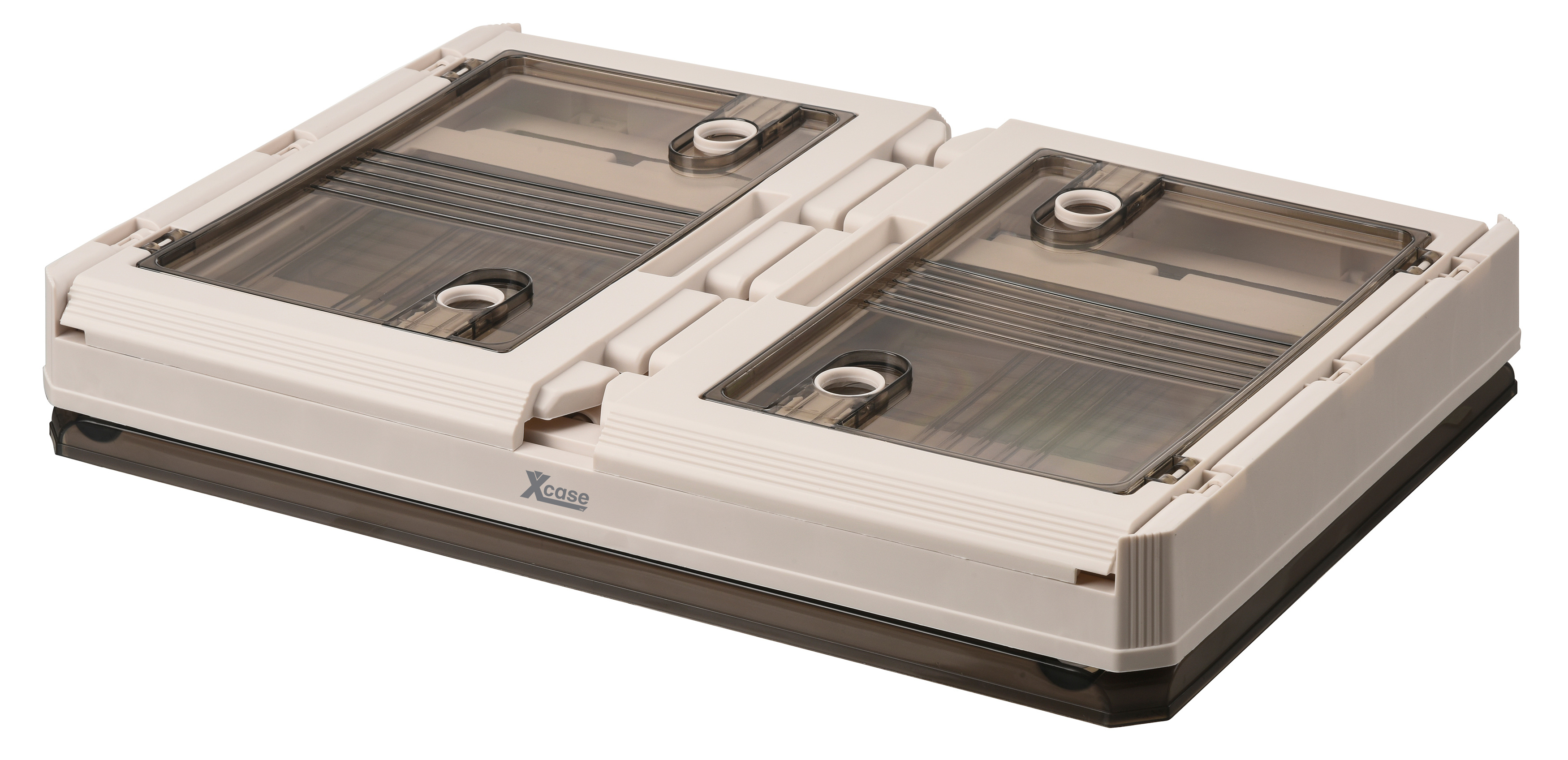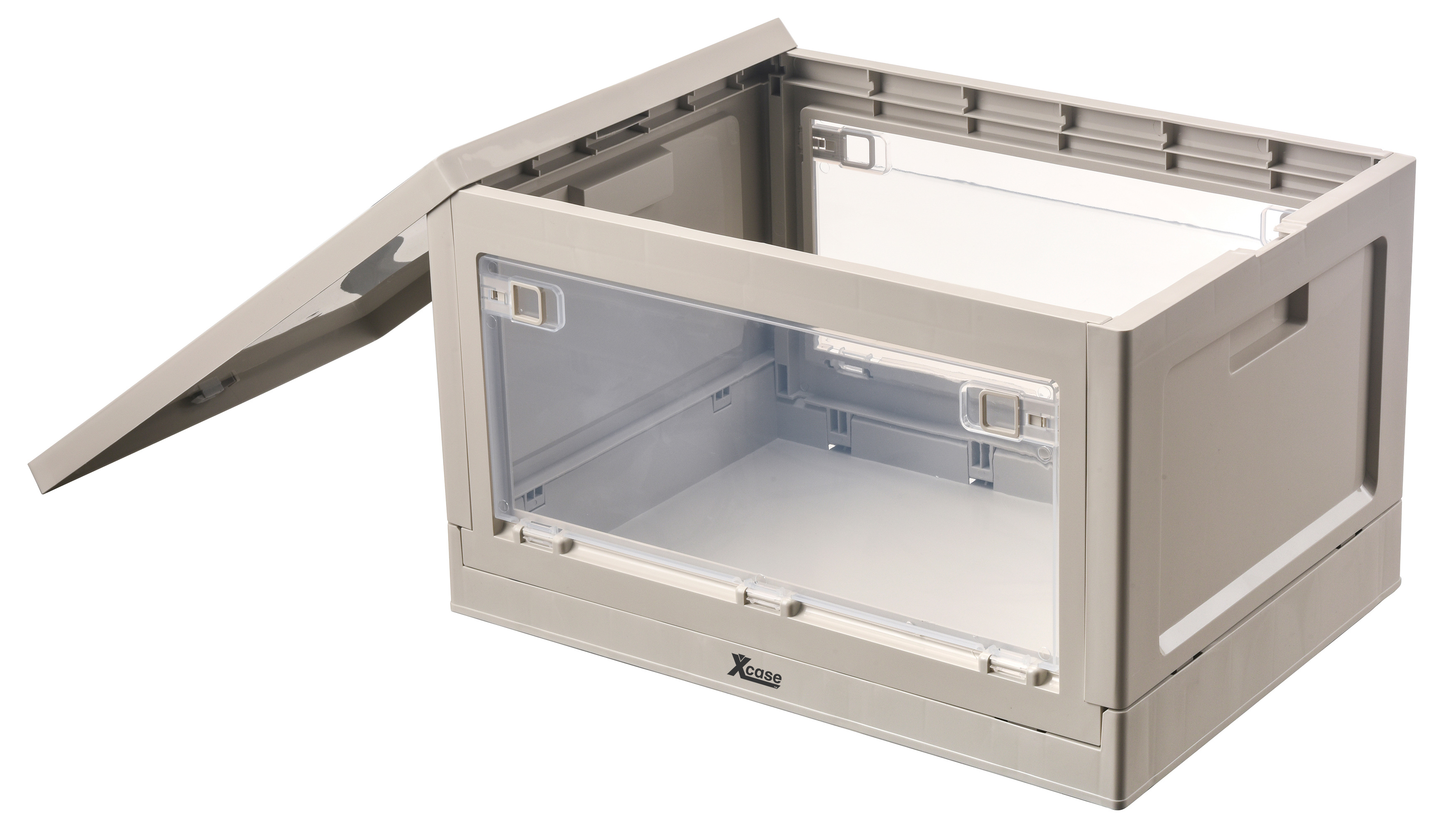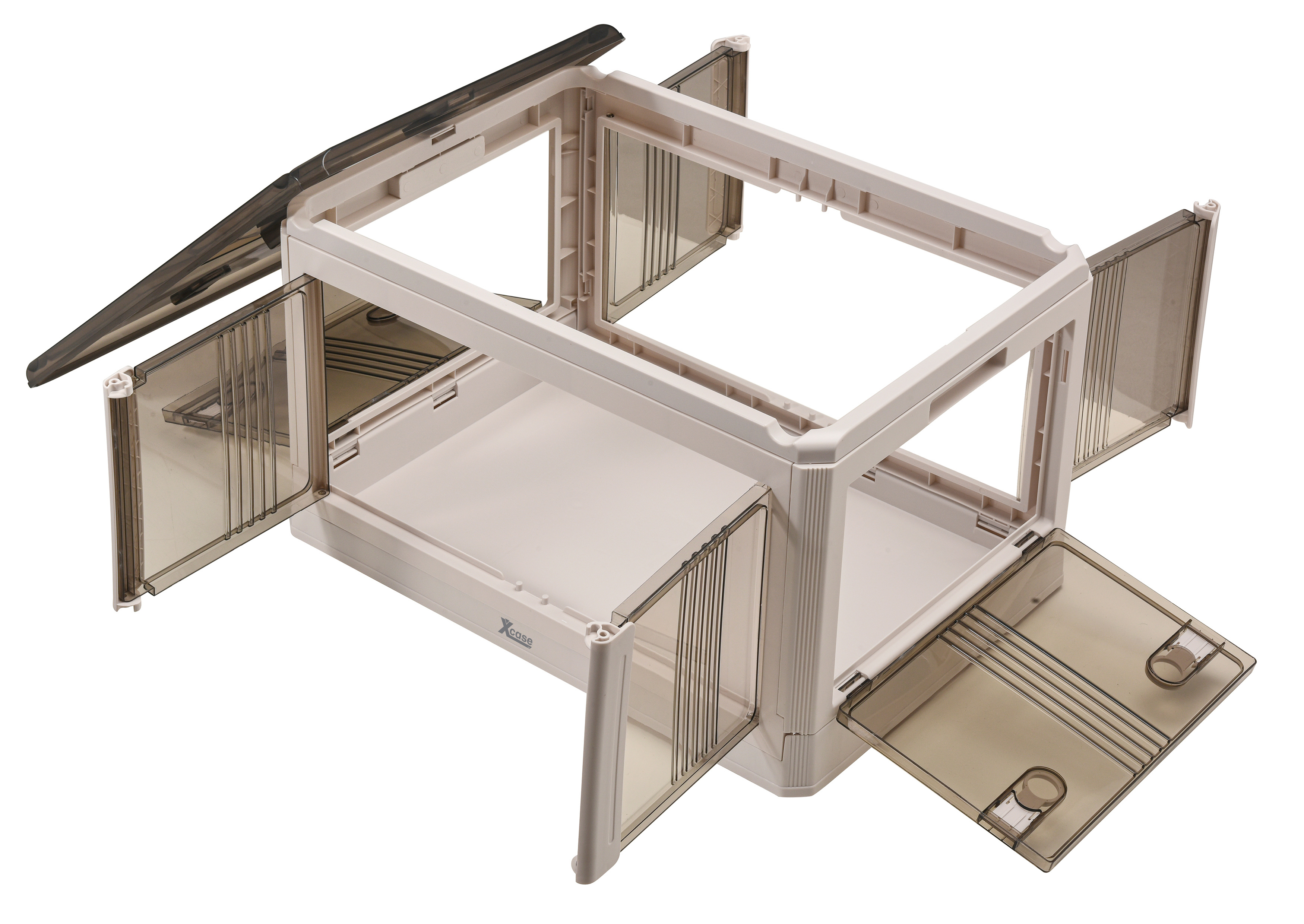 Das Aufbewahrungssystem von Xcase besteht aus stapelbaren Klappboxen mit Deckel zur systematischen Organisation von Werkzeug, Kabeln oder Kleidung. Die Boxen verfügen über seitliche Zugriffsklappen, die den Inhalt auch im gestapelten Zustand zugänglich machen.