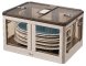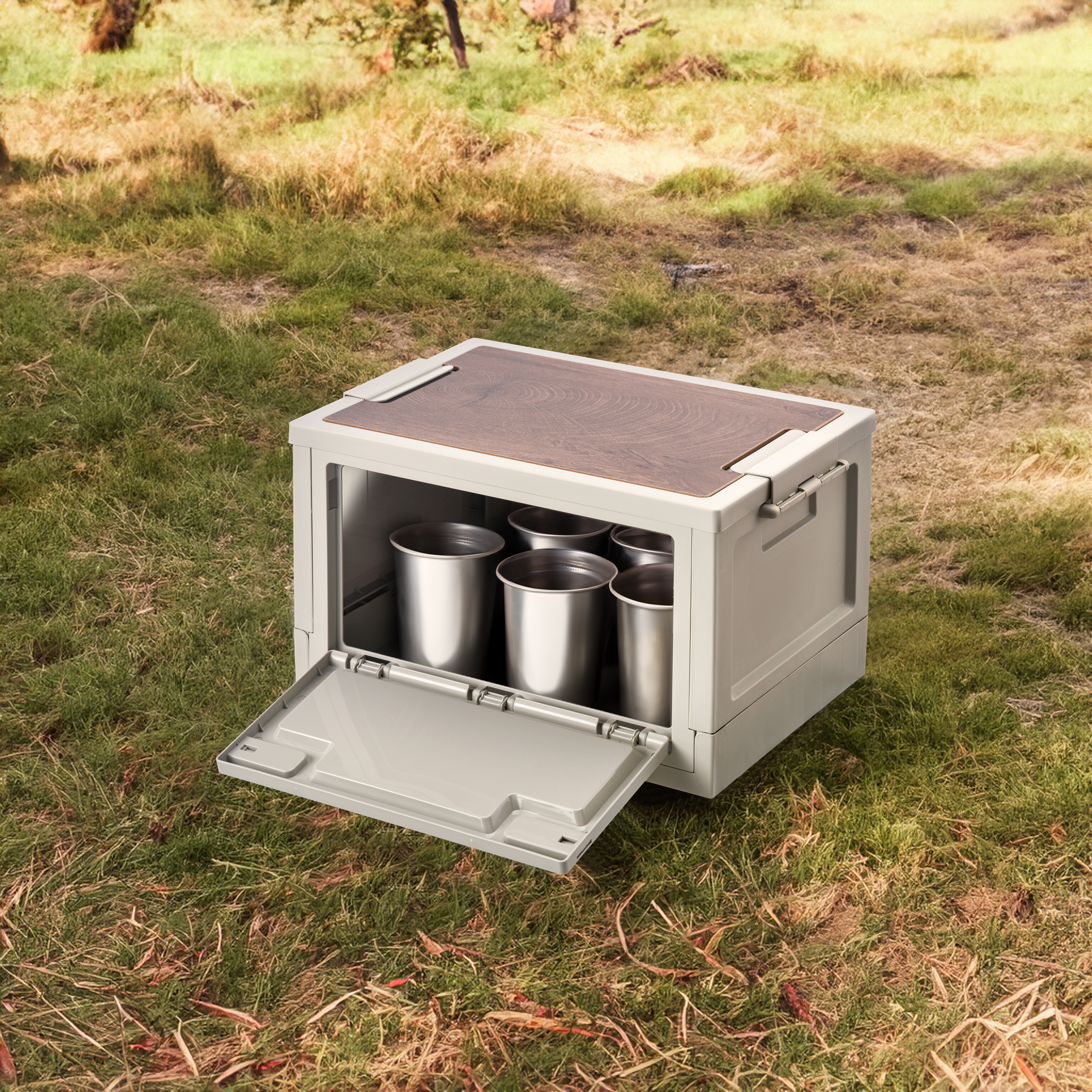 Eine (optionale) herausnehmbare MDF-Platte in Holzoptik erweitert die Einsatzmöglichkeiten der Boxen als Campingtisch-, Arbeits- oder Ablagefläche. Das System eignet sich für den Einsatz in Kellerräumen, Abstellkammern sowie beim Camping und als Transportlösung.