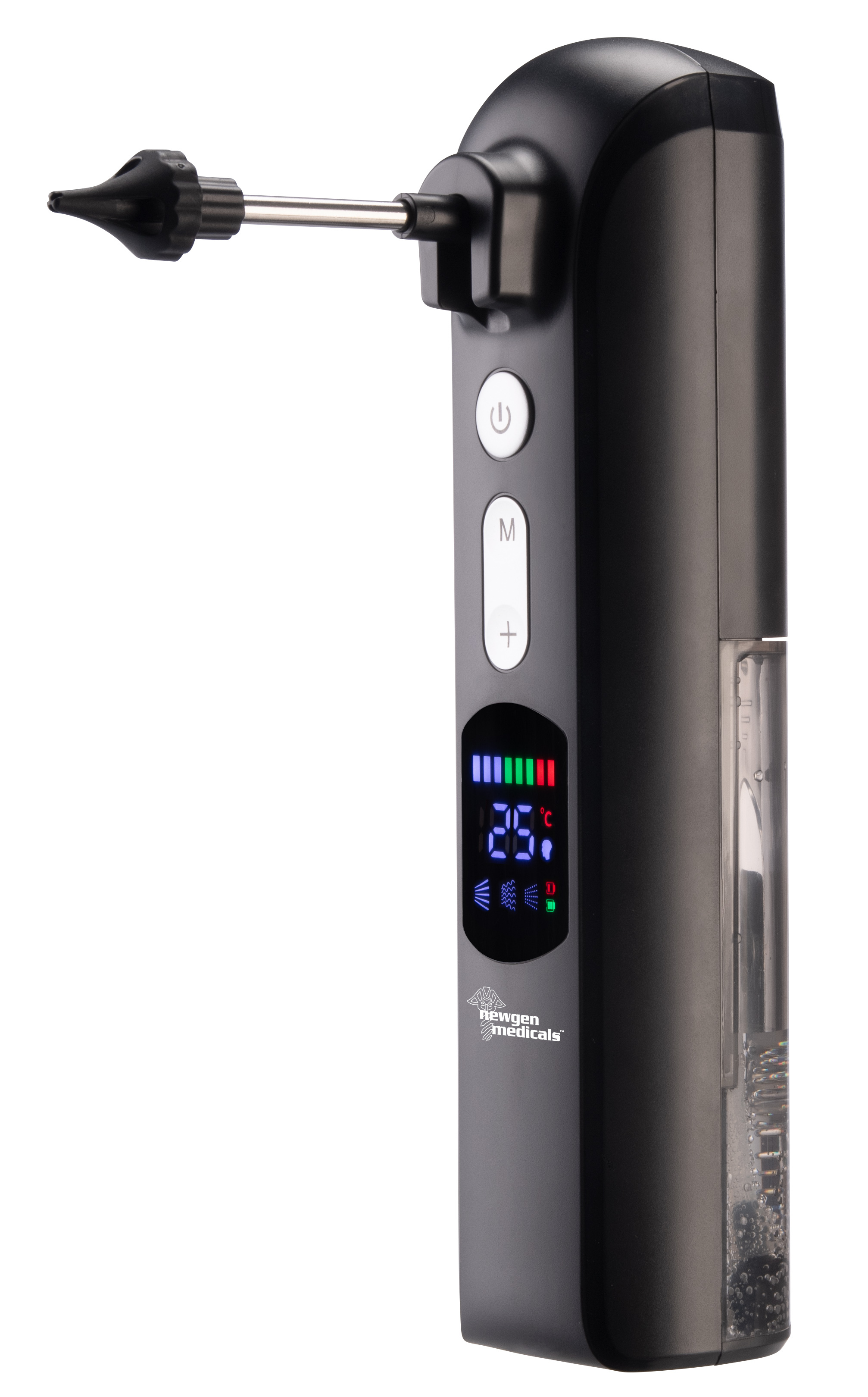 Der Akku-Ohrreiniger von newgen medicals ermöglicht die schonende Entfernung von Ohrenschmalz durch eine integrierte Wasserspülung. Das System bietet drei Reinigungsmodi mit jeweils acht Intensitätsstufen zur individuellen Anpassung.
