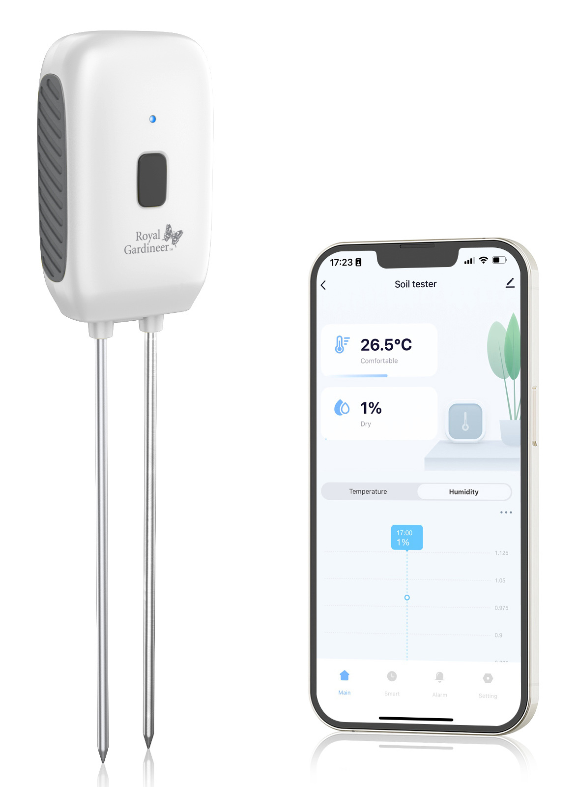 Ein smarte Sensor von Royal Gardineer misst präzise die Bodenfeuchte und -temperatur und überträgt die Daten direkt an die kostenlose App „ELESION“ auf dem Smartphone. Die App eignet sich für Blumen, Kräuter und andere Pflanzen im Garten oder auf der Terrasse.