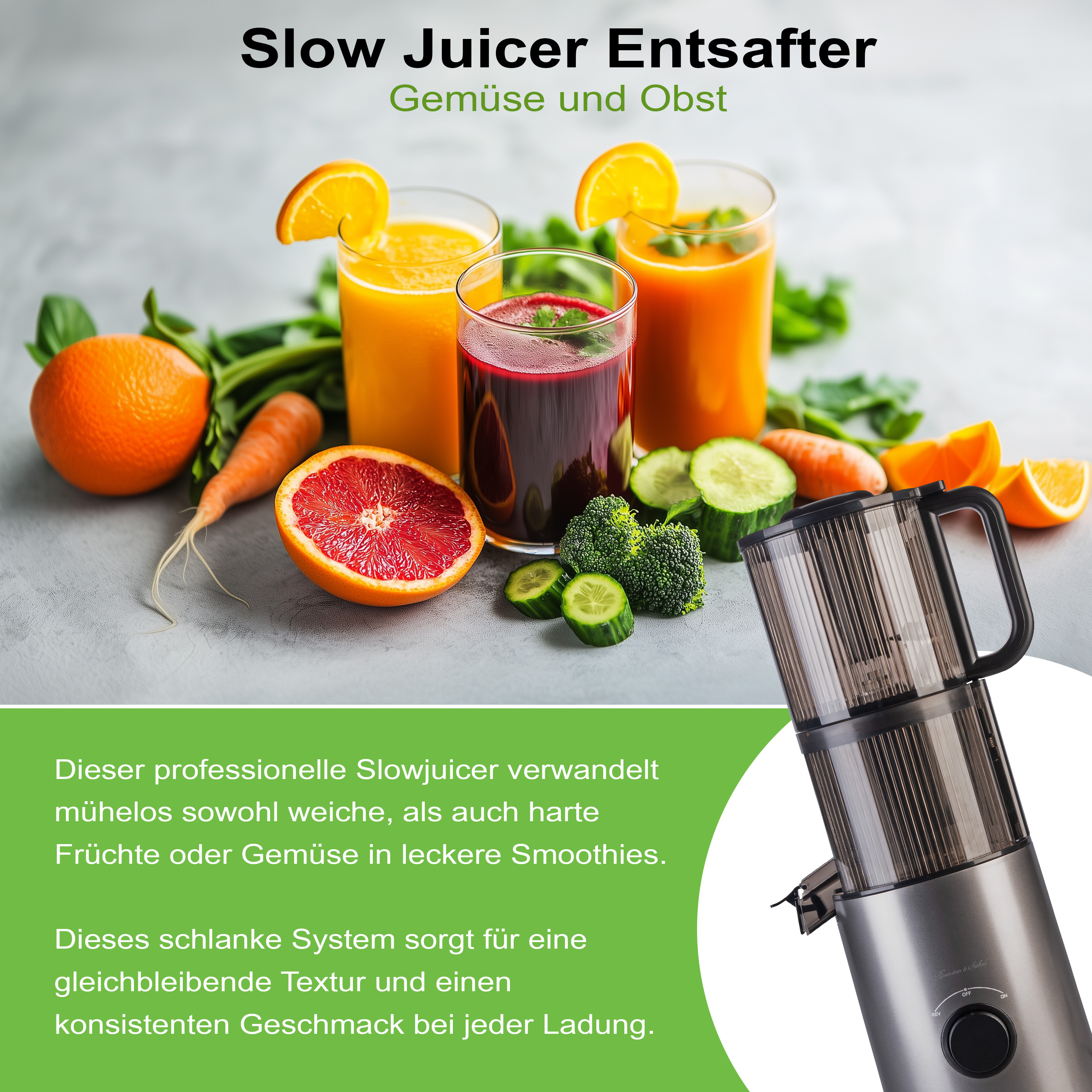 Geräuscharmer Motor: Der 200-Watt-Motor verarbeitet auch härtere Zutaten zuverlässig und arbeitet leise, so dass der Entsafter zu jeder Tageszeit genutzt werden kann, ohne die Hausgemeinschaft zu stören.