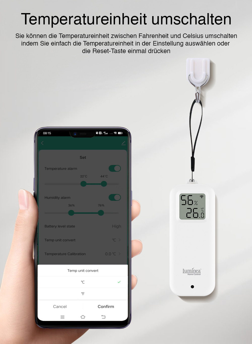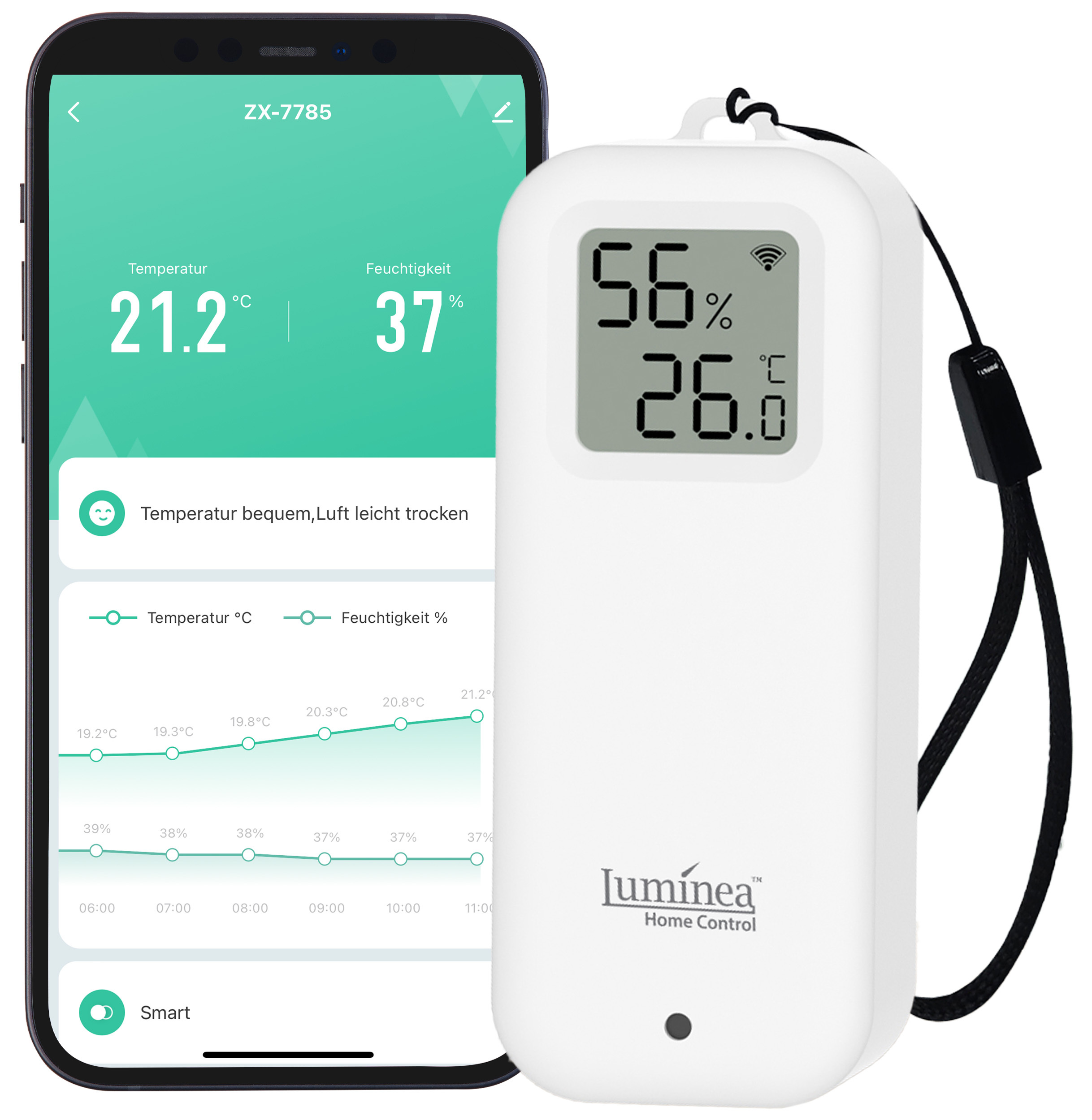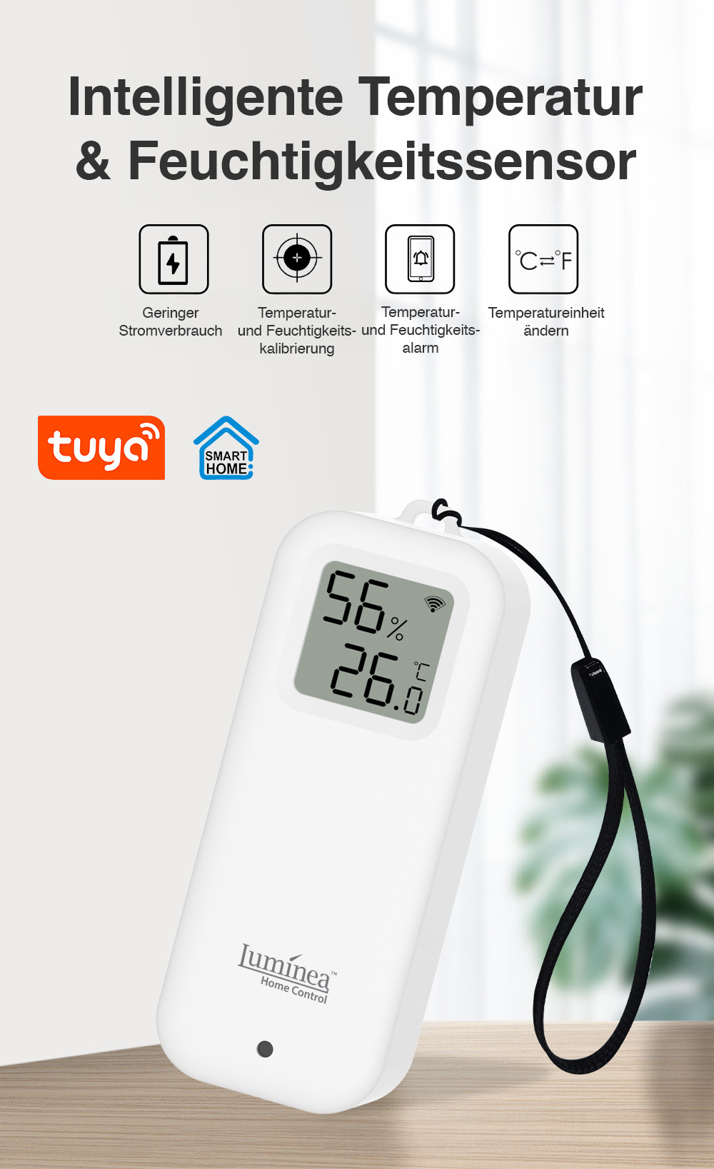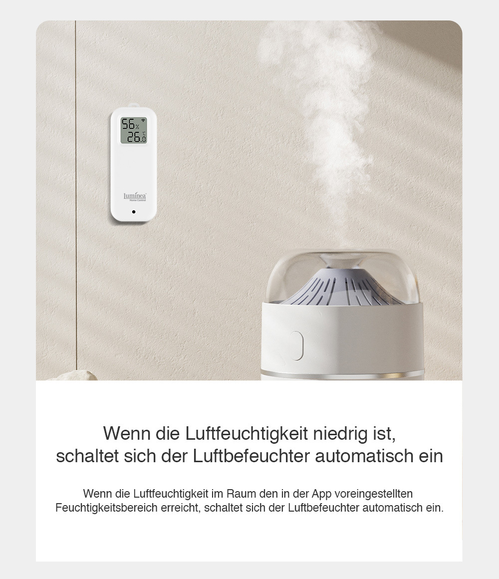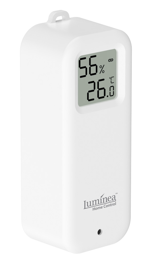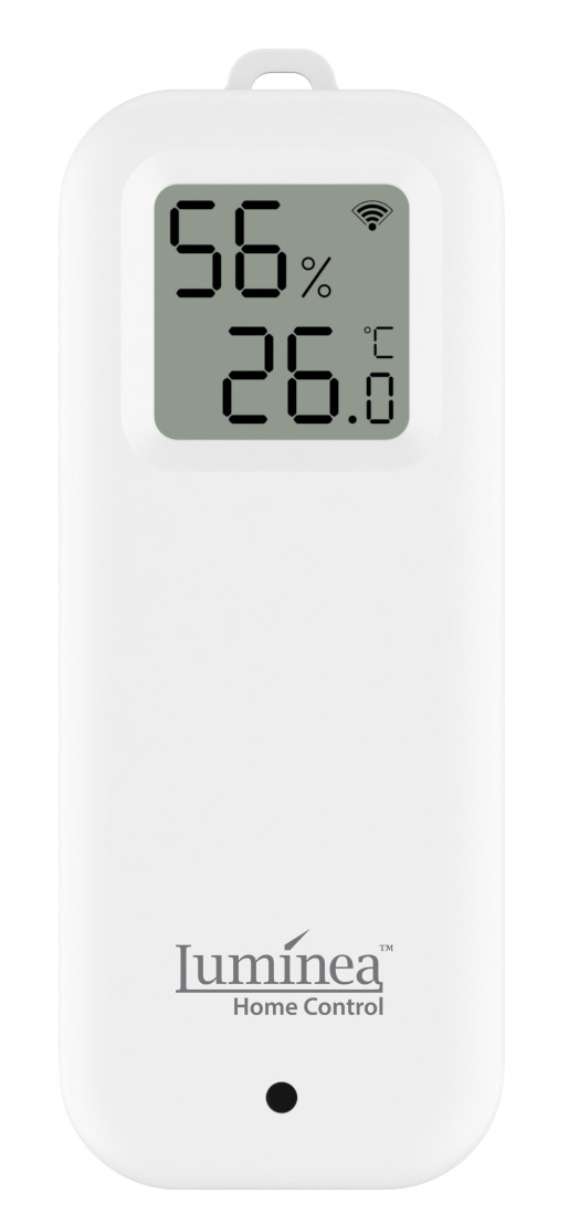 Der WLAN-Temperatur- und Luftfeuchtigkeitssensor von Luminia Home Control zeigt die präzise Temperatur und Luftfeuchtigkeit entweder direkt auf seinem Display oder auf dem Smartphone in Echtzeit an.