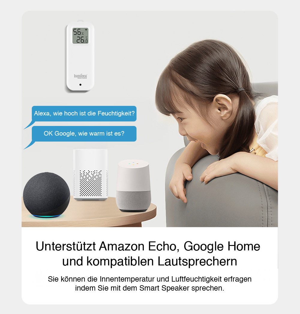 (lifepr) (Buggingen, 15.05.2025) Der Luminea Home Control Sensor misst präzise die Temperatur und Luftfeuchtigkeit und zeigt die Werte direkt auf dem Display an - damit können sie bequem über das Smartphone abgerufen werden - sogar unterwegs dank WLAN und der ELESION App! Die Unterstützung von Alexa, Google Assistant und Siri ermöglicht eine einfache Daten-Abfrage per Sprachassistent; individuell einstellbare Grenzwerte sorgen dafür, dass Benutzer automatische Benachrichtigungen bei Abweichungen von den Werten erhalten. Die reibungslose Integration ins Smart Home wird durch die Kompatibilität mit dem System von Smart Life und Tuya gewährleistet.