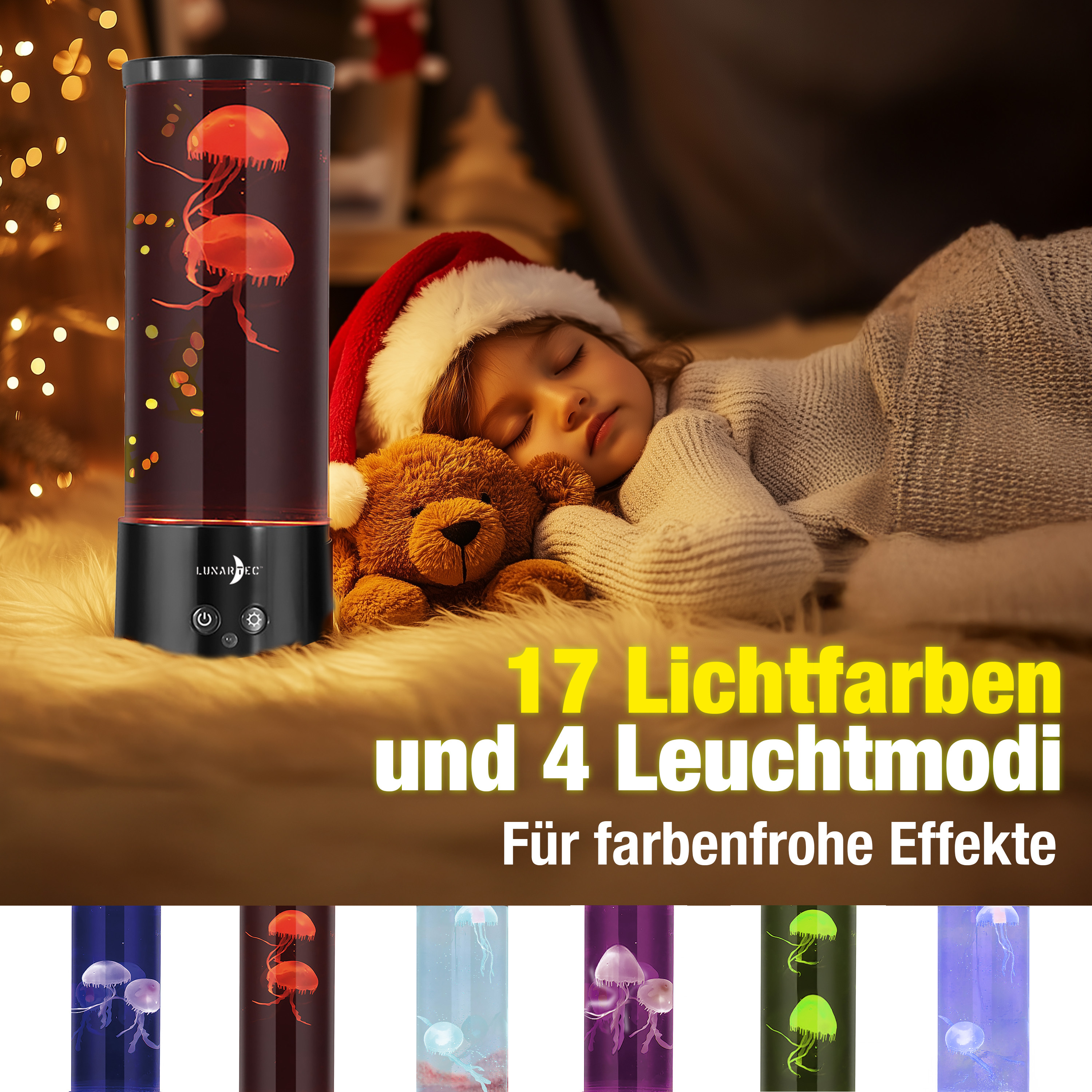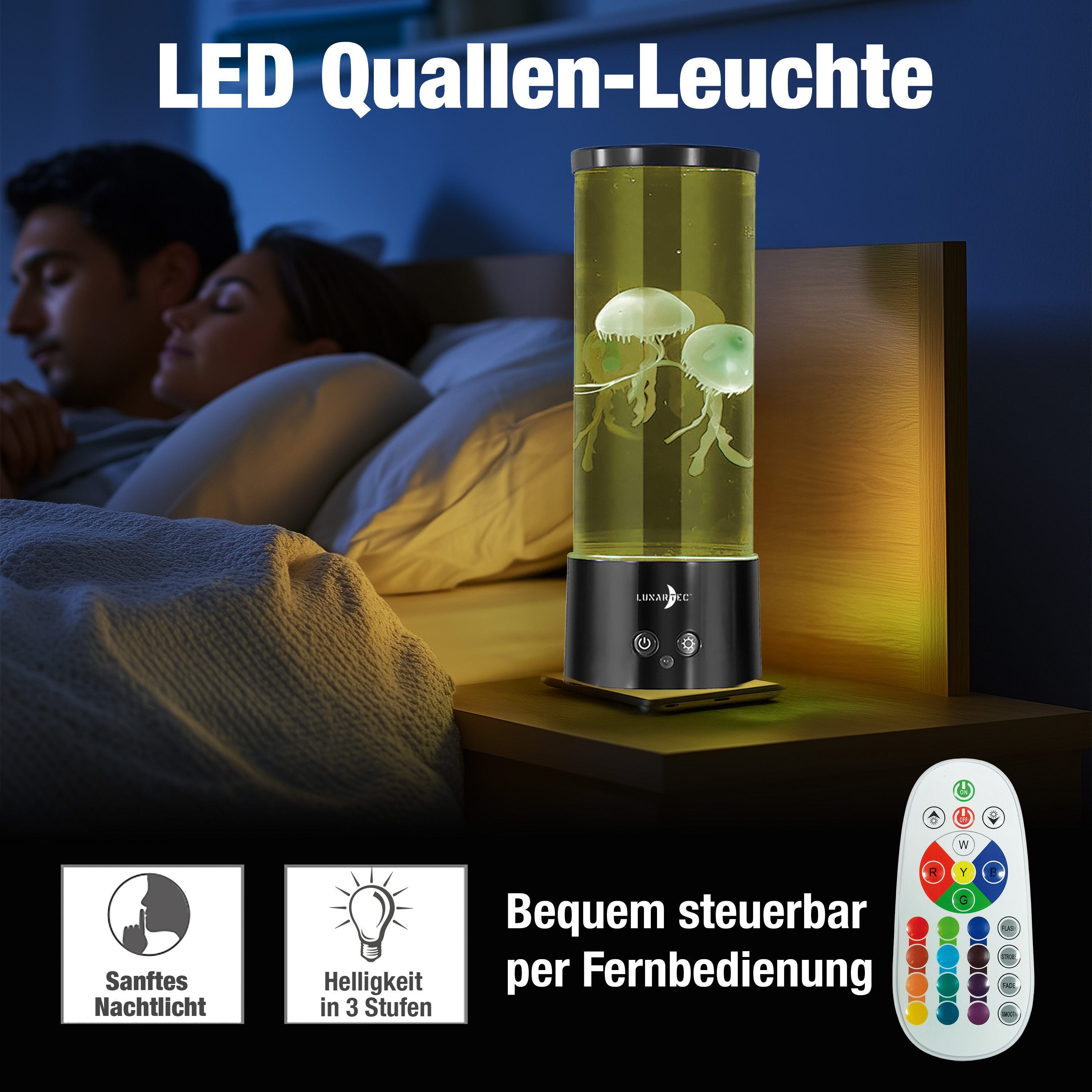 Stilvolle Lichtstimmung für jede Gelegenheit: Die dimmbare LED-Quallen-Lampe von Lunartec bietet 17 Farben und 4 Beleuchtungsmodi. Ob sanftes Farbspiel oder dezente Beleuchtung: Mit dieser Leuchte lassen sich Räume individuell gestalten.