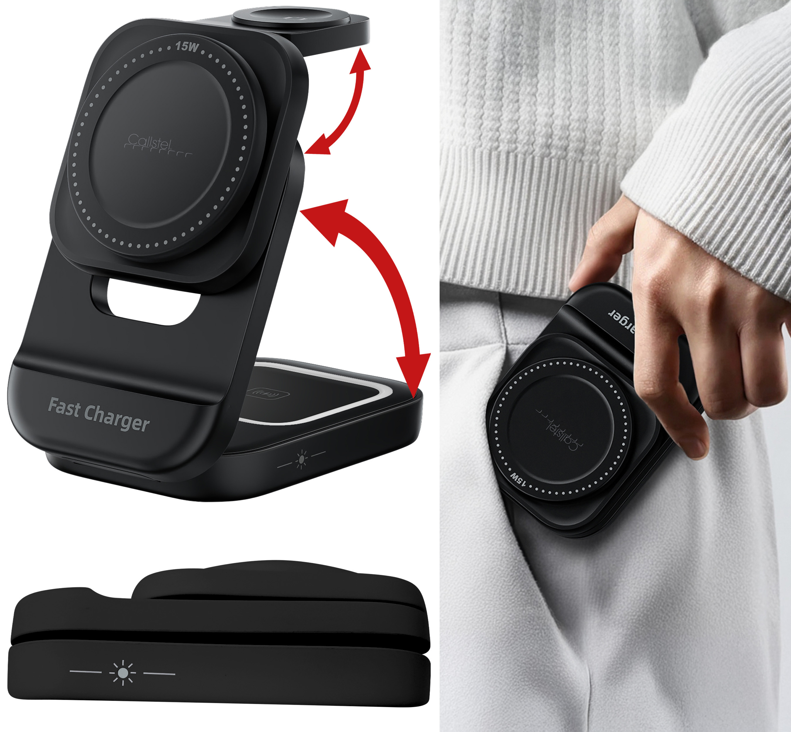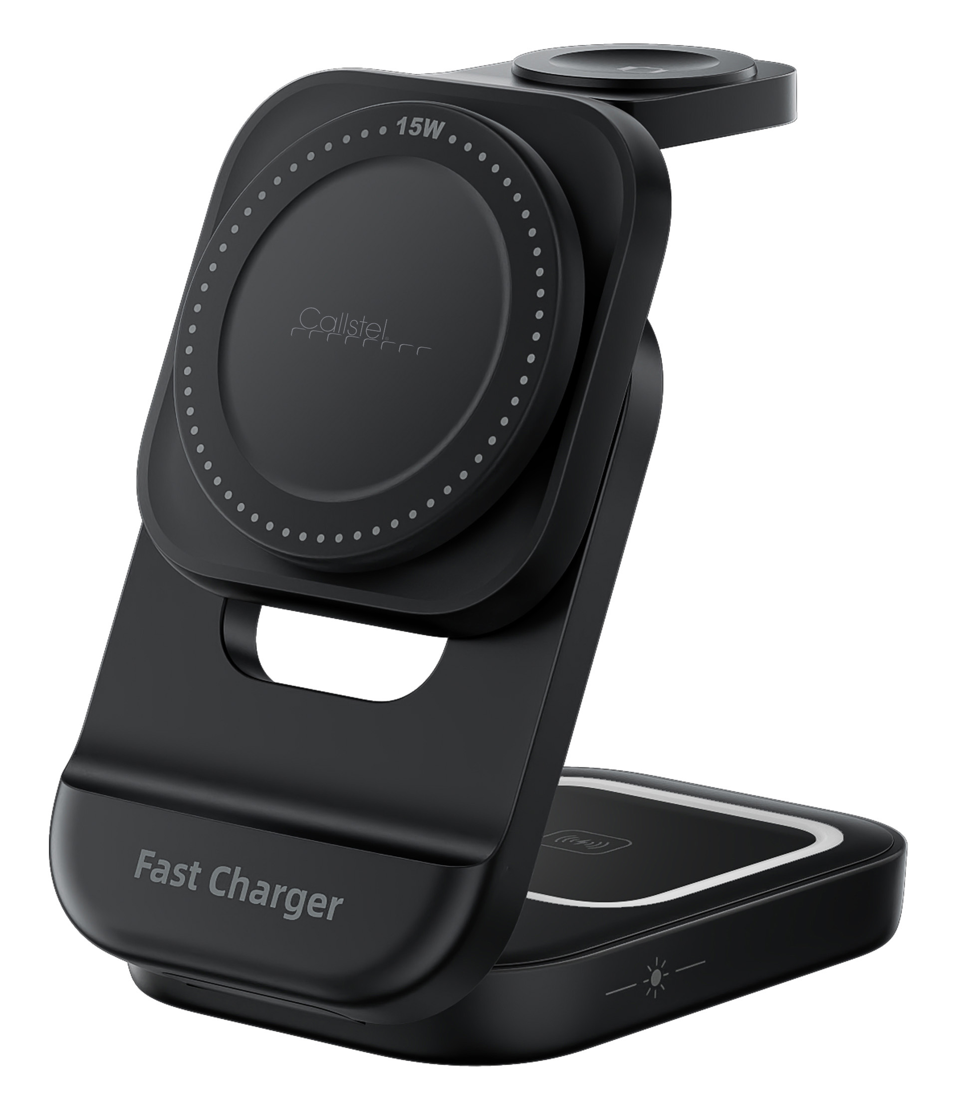 Die faltbare 3in1-Ladestation von Callstel ist kompatibel zu iPhone, Apple Watch und AirPods. Alle drei Geräte lassen sich über die Qi-kompatiblen Ladeflächen gleichzeitig mit nur einem Stromanschluss aufladen. Ideal für Nachttisch, Schreibtisch oder auf Reisen. Diese Lösung spart Platz und vereinfacht den Alltag.